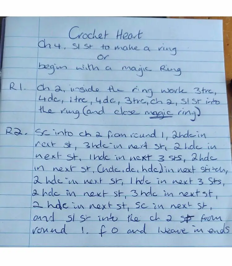 She asks that hearts are made with pink, red or dark purple double knitting wool. See the picture below for the crochet pattern: