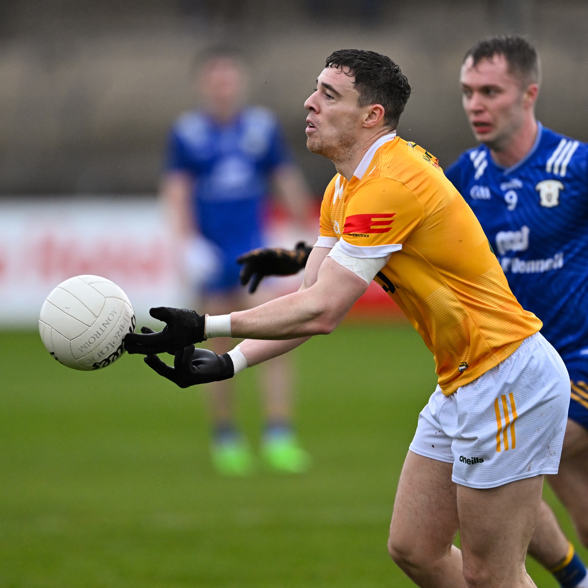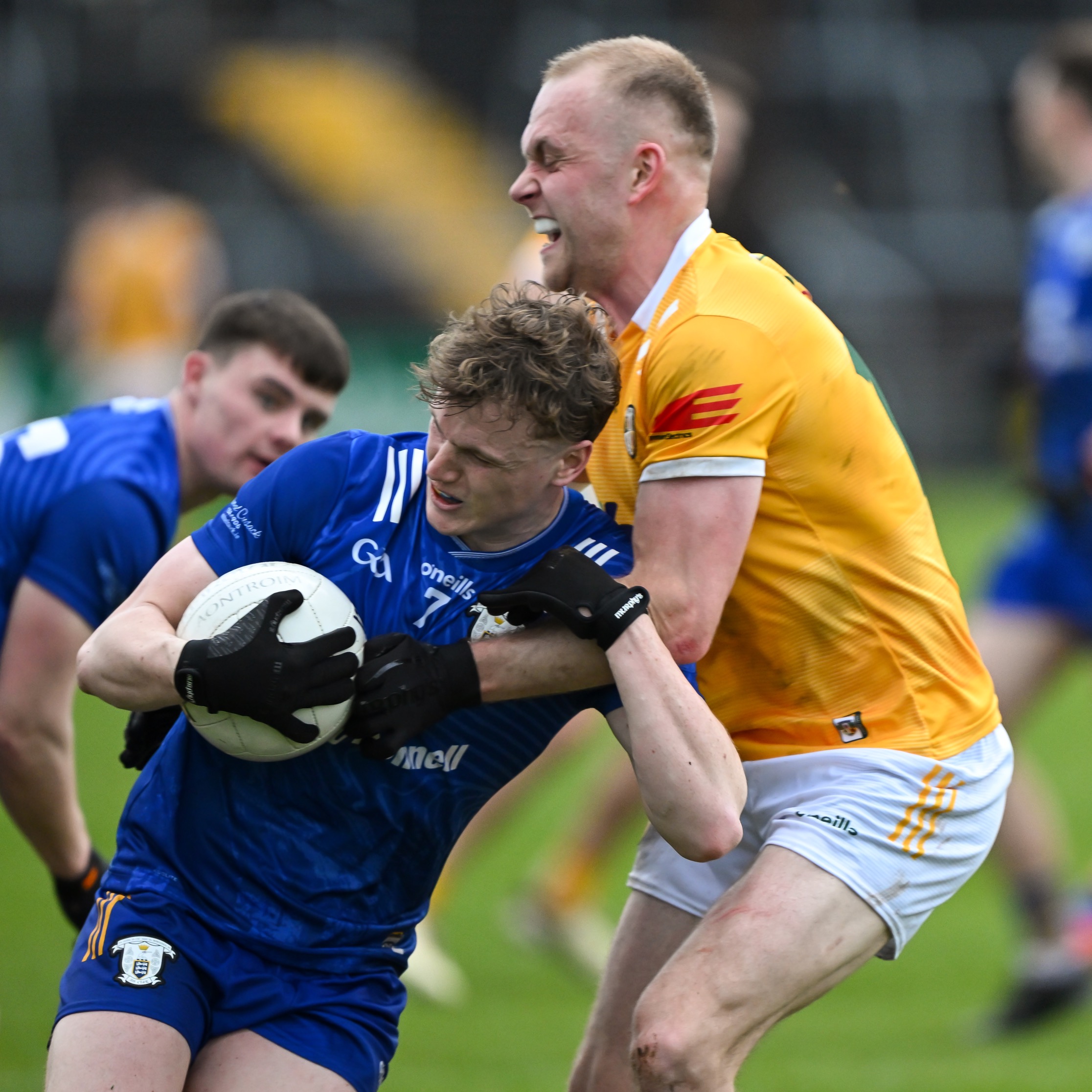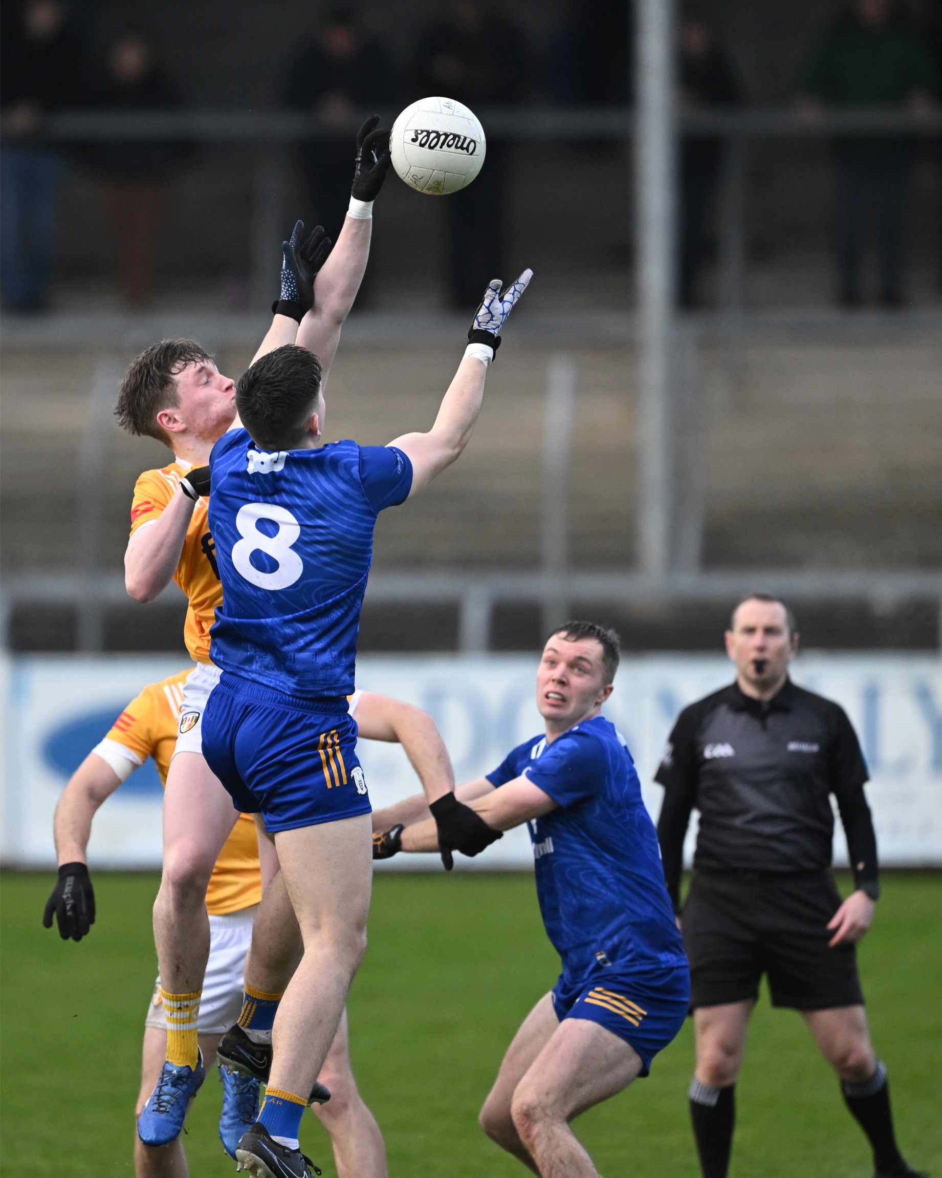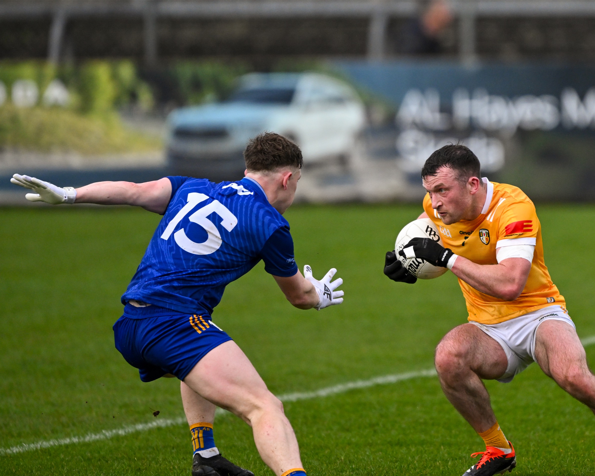Antrim goalkeeper Michael Byrne took Joe McGann clean out of it when the St Breckan’s gained possession 65m from goal and was just about to show his pace. A free was awarded but no yellow card flashed yet in the next passage of play at the other end both Ikem Ugwueru and Padraig McBride found themselves entering the book for much milder offences.