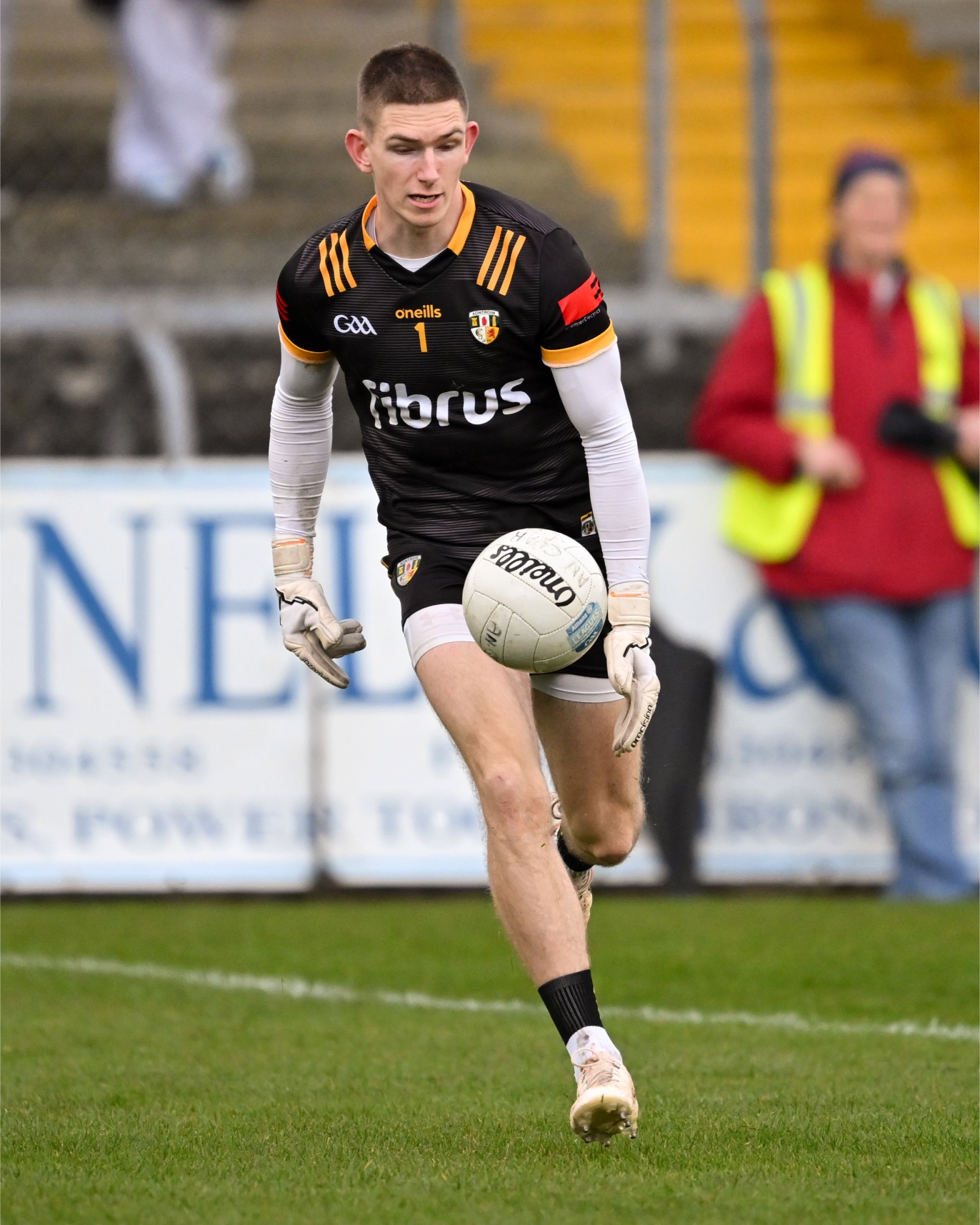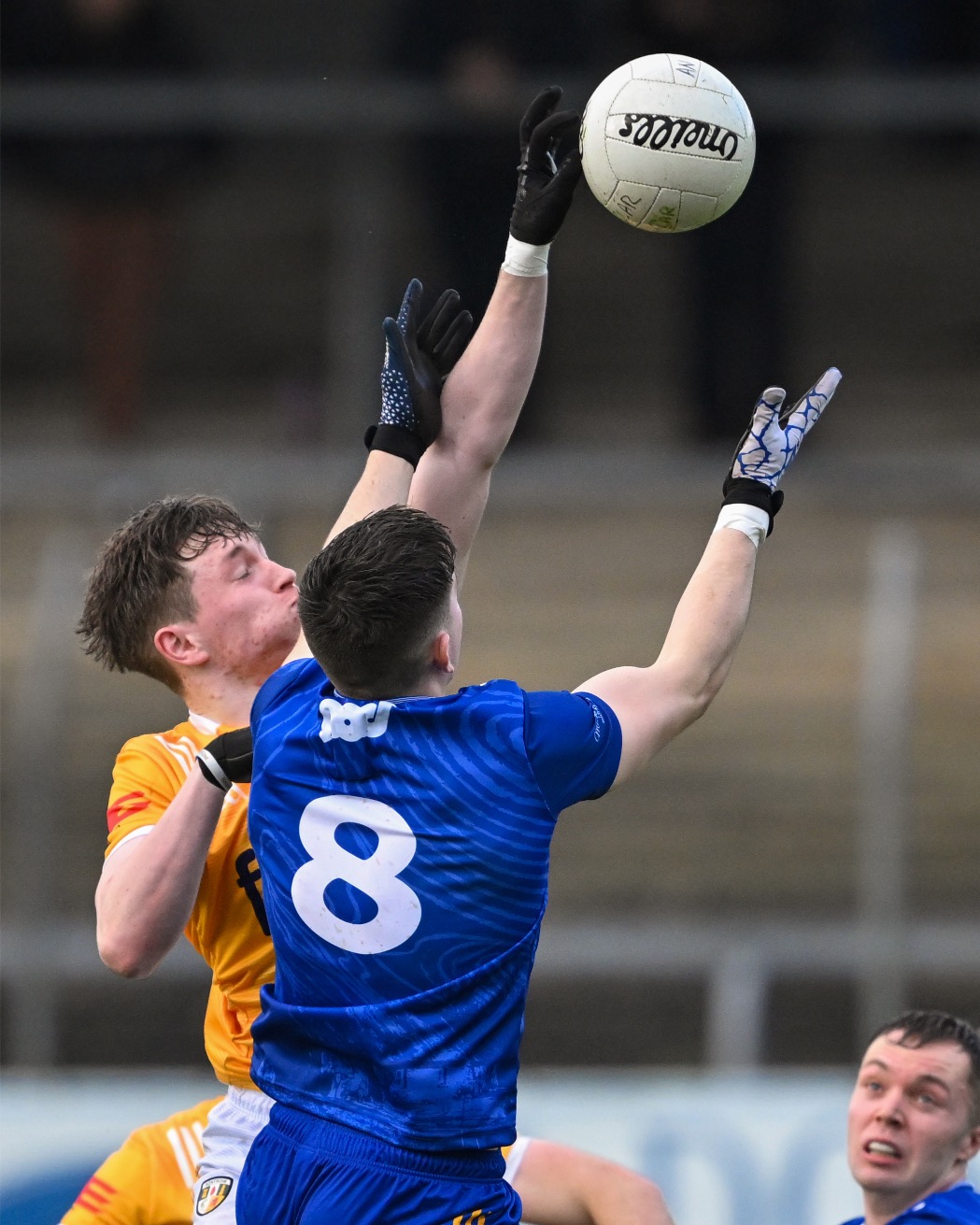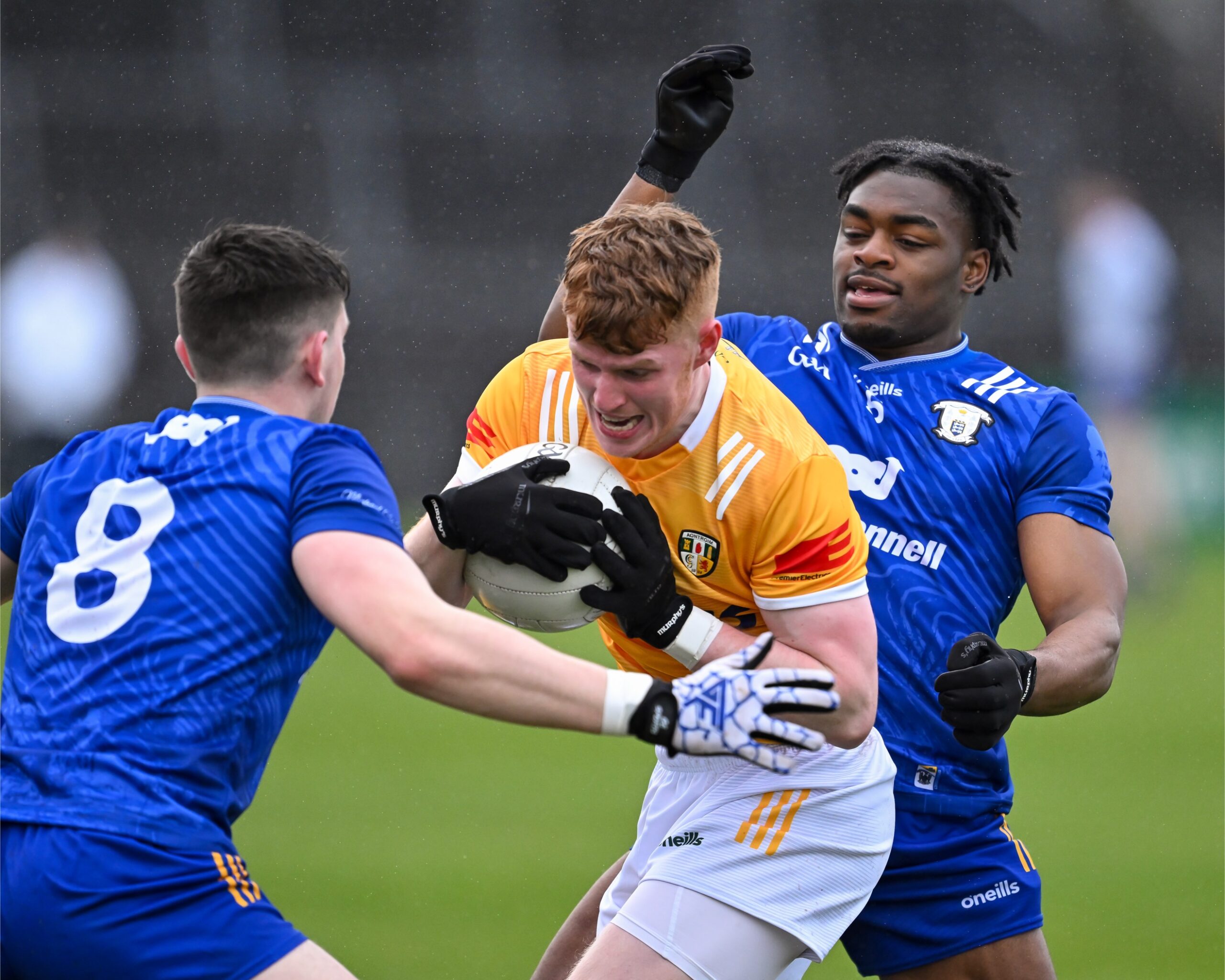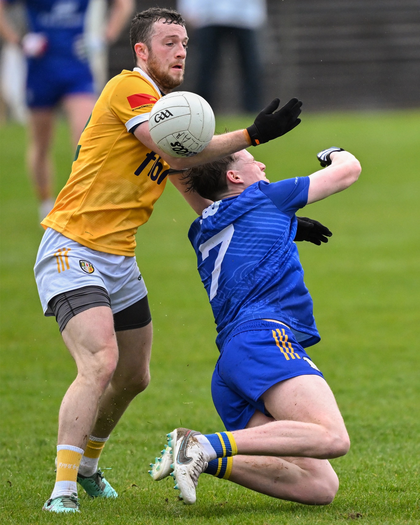 Antrim goalkeeper Michael Byrne took Joe McGann clean out of it when the St Breckan’s gained possession 65m from goal and was just about to show his pace. A free was awarded but no yellow card flashed yet in the next passage of play at the other end both Ikem Ugwueru and Padraig McBride found themselves entering the book for much milder offences.