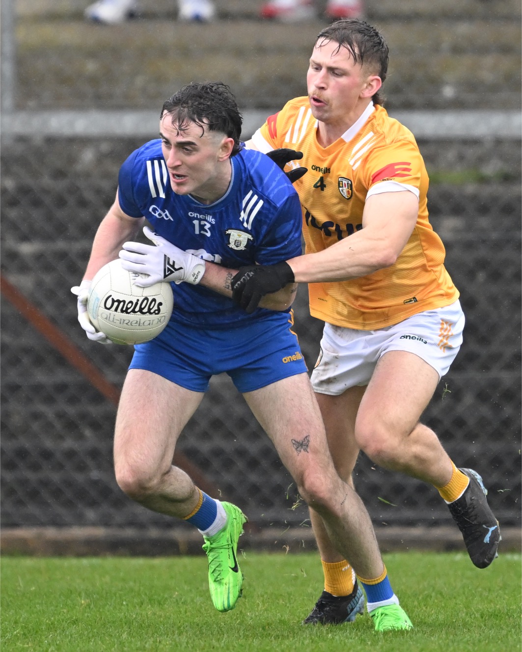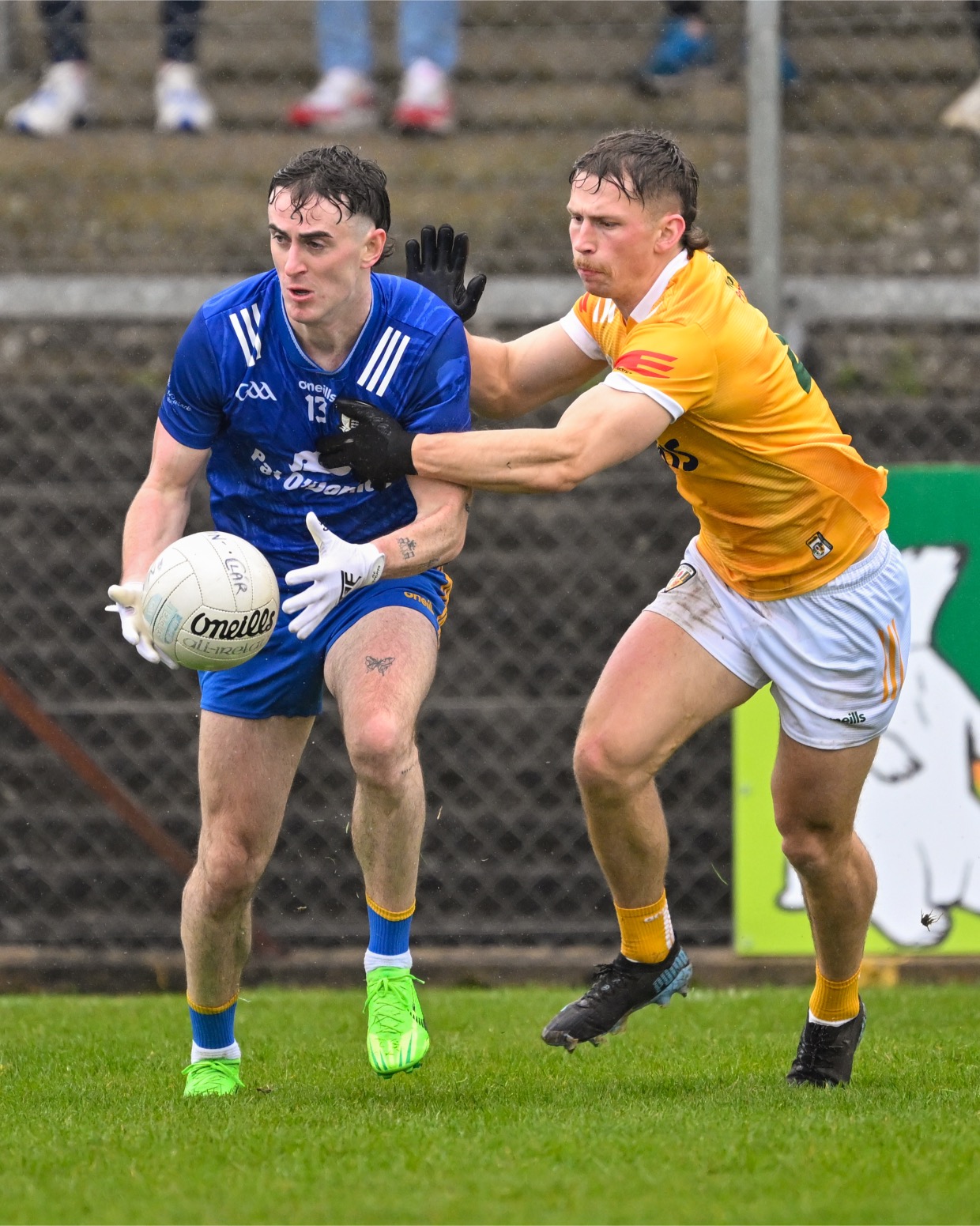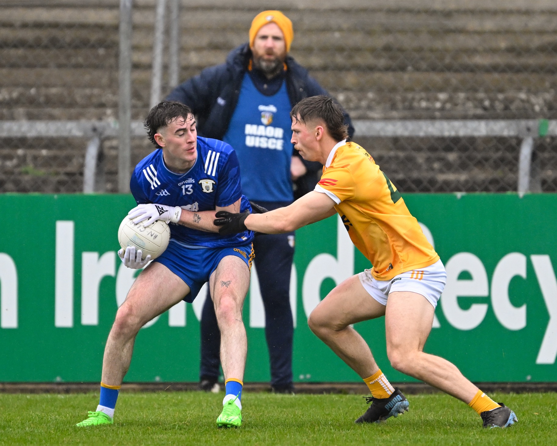 Joe McGann under pressure from Kavan Keenan. Photograph: Gerard O’Neill