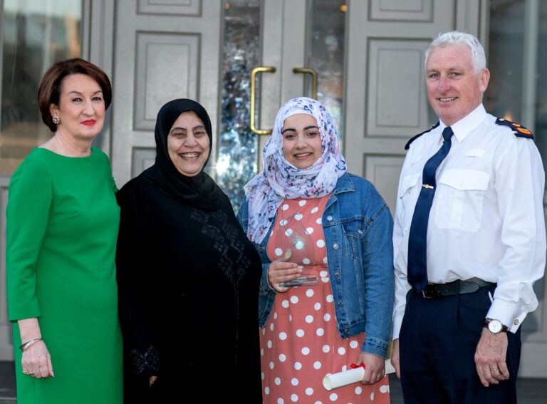 *L-R Rose Hynes, Chairman Shannon Group, Razan Abdel Wahed, who arrived in Ireland as a Syrian refugee in 2017 and now lives in Ennistymon, her mum Zahra and Supt Brendan McDonagh. Pic Arthur Ellis.