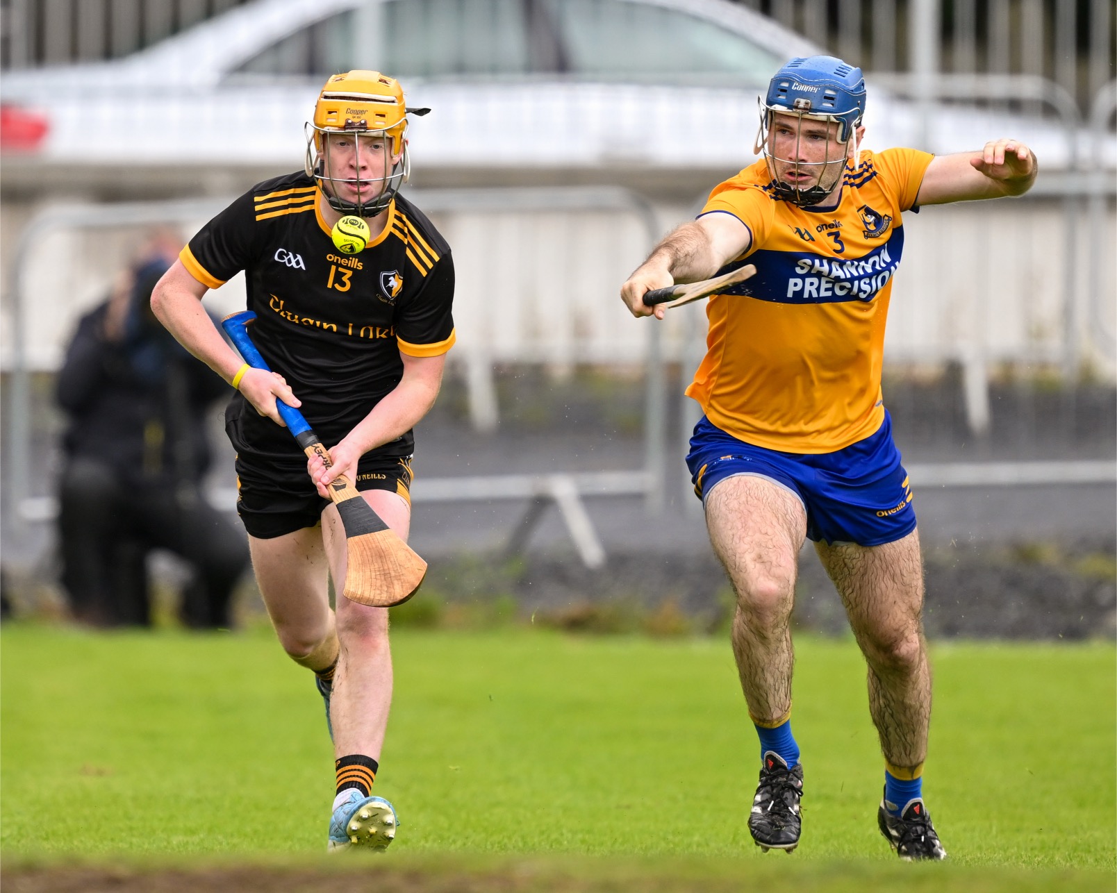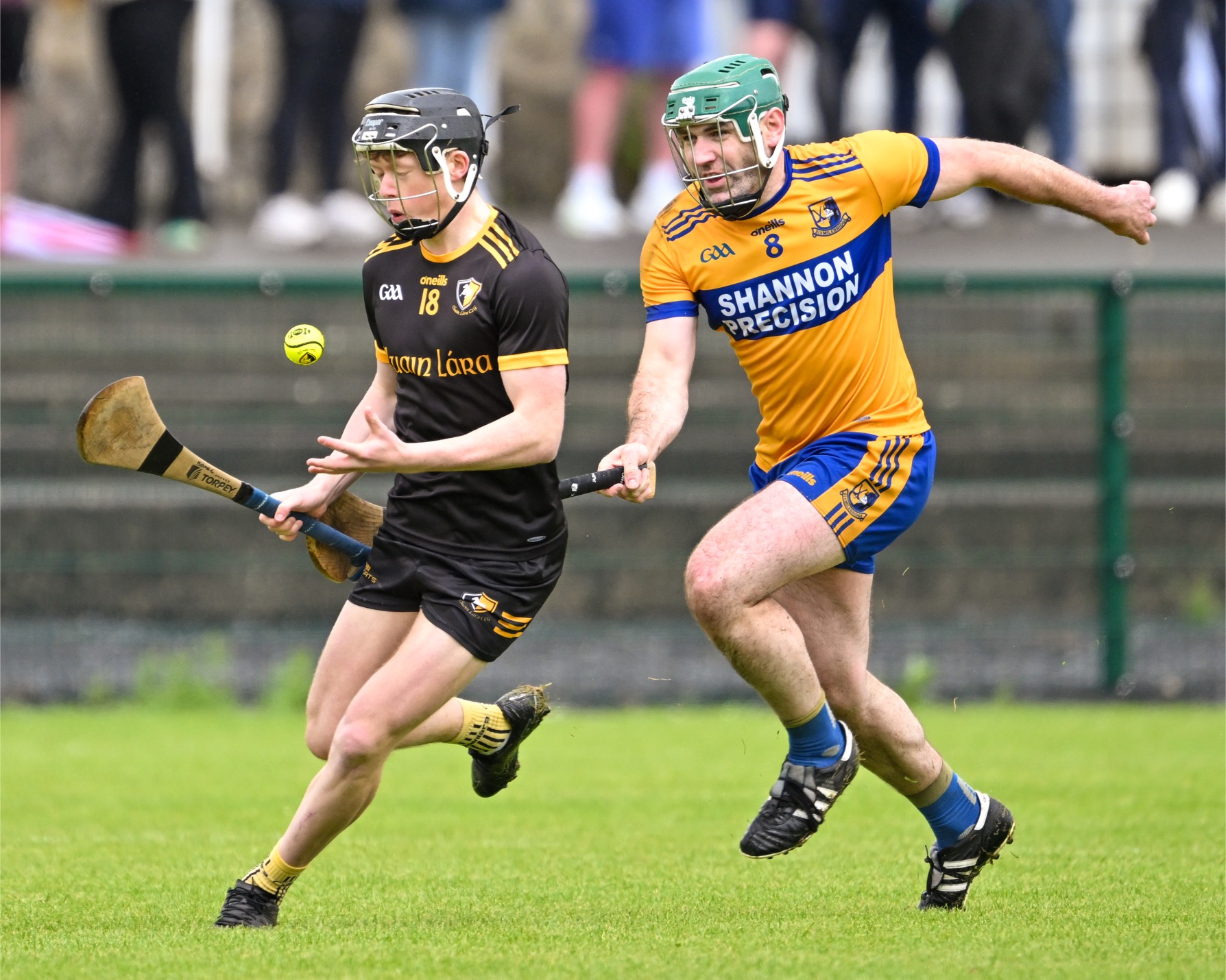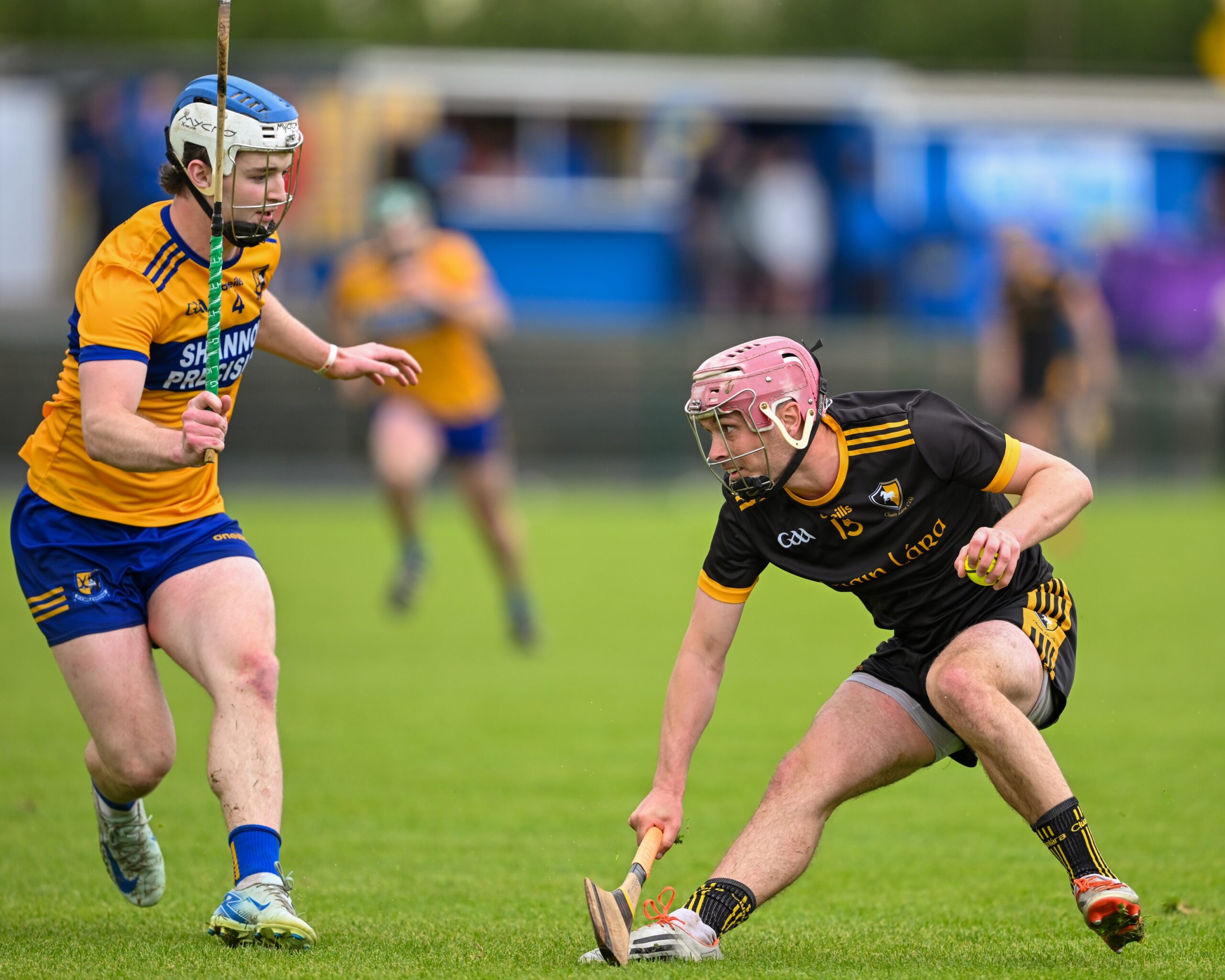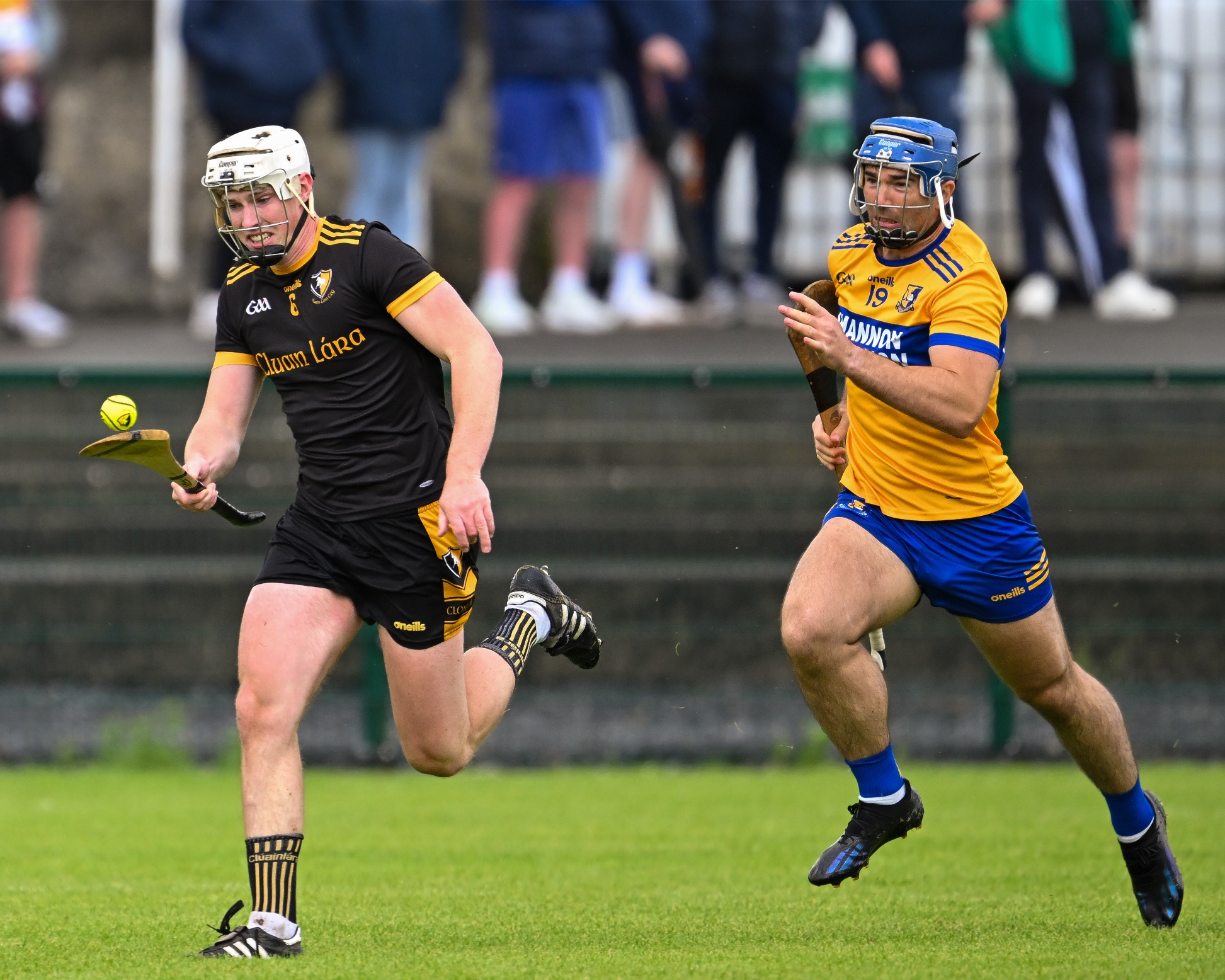 *Clonlara’s Colm Galvin is chased by Luke O’Halloran of Sixmilebridge. Photograph: Gerard O’Neill