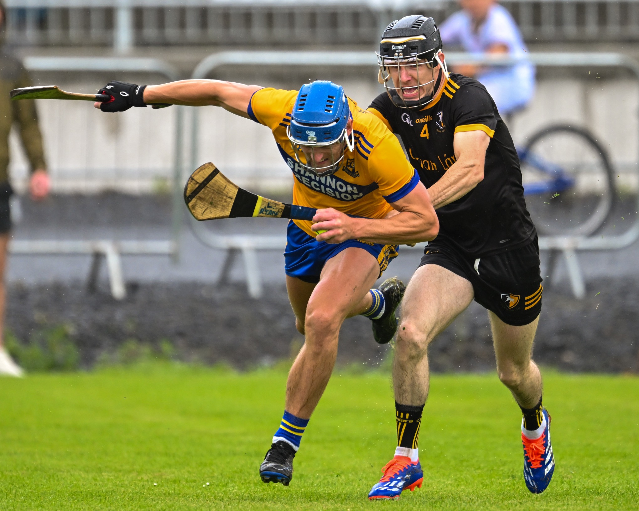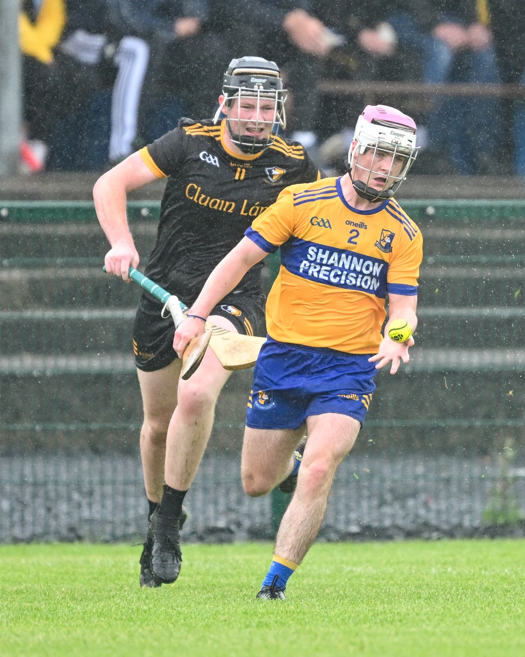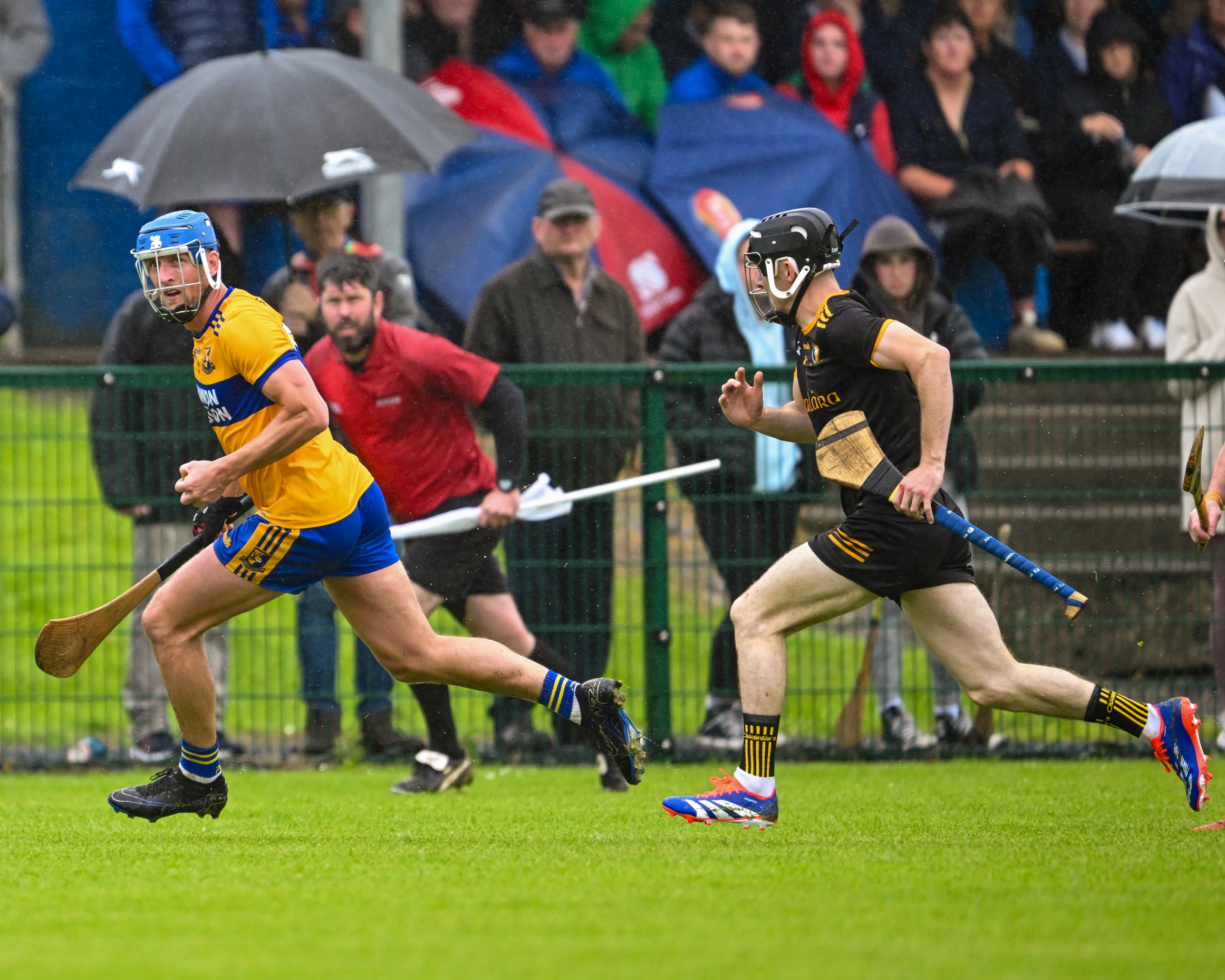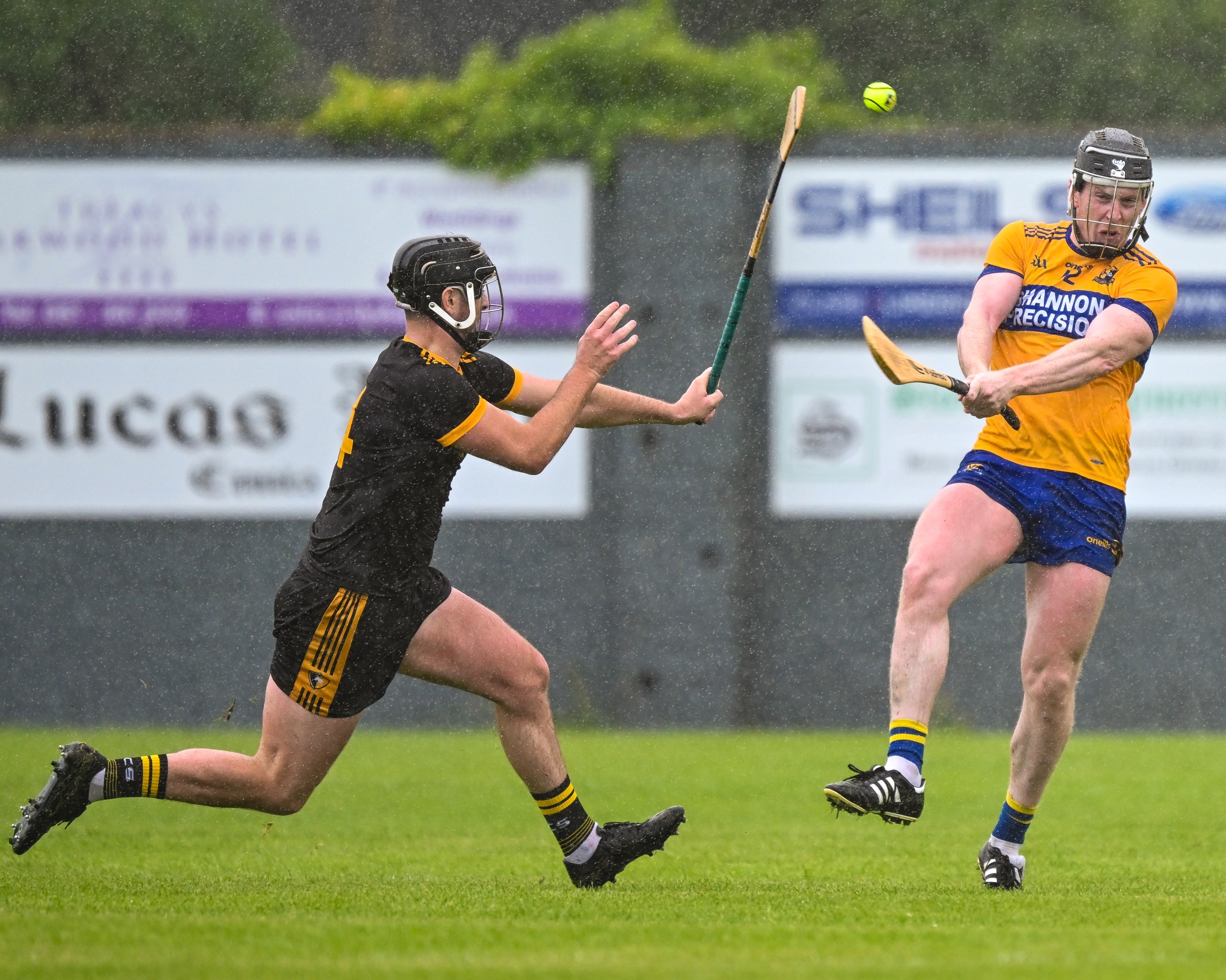 *Clonlara’s Colm Galvin is chased by Luke O’Halloran of Sixmilebridge. Photograph: Gerard O’Neill