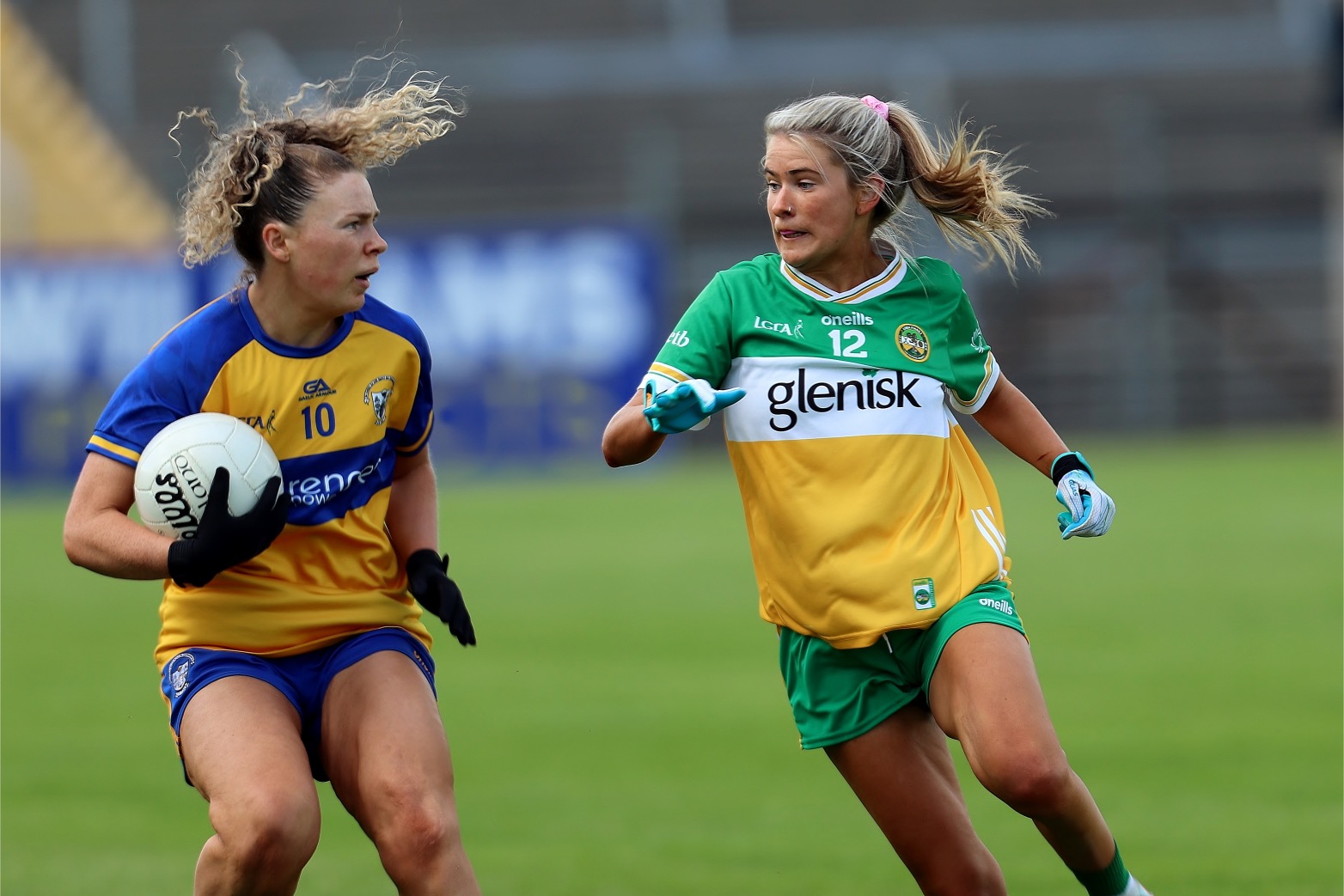 Clare’s Grainne Harvey with Offaly’s Anita Watkins. Photograph: Burren Eye Photography