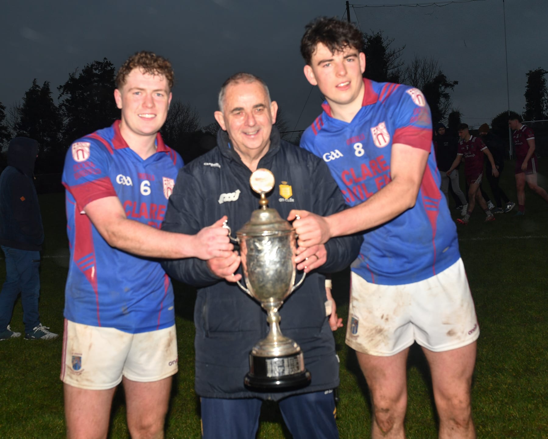 Clare GAA officer Bernard Keane presented the John Marrinan memorial cup to joint captains Fionn Kelleher and James Curran.
