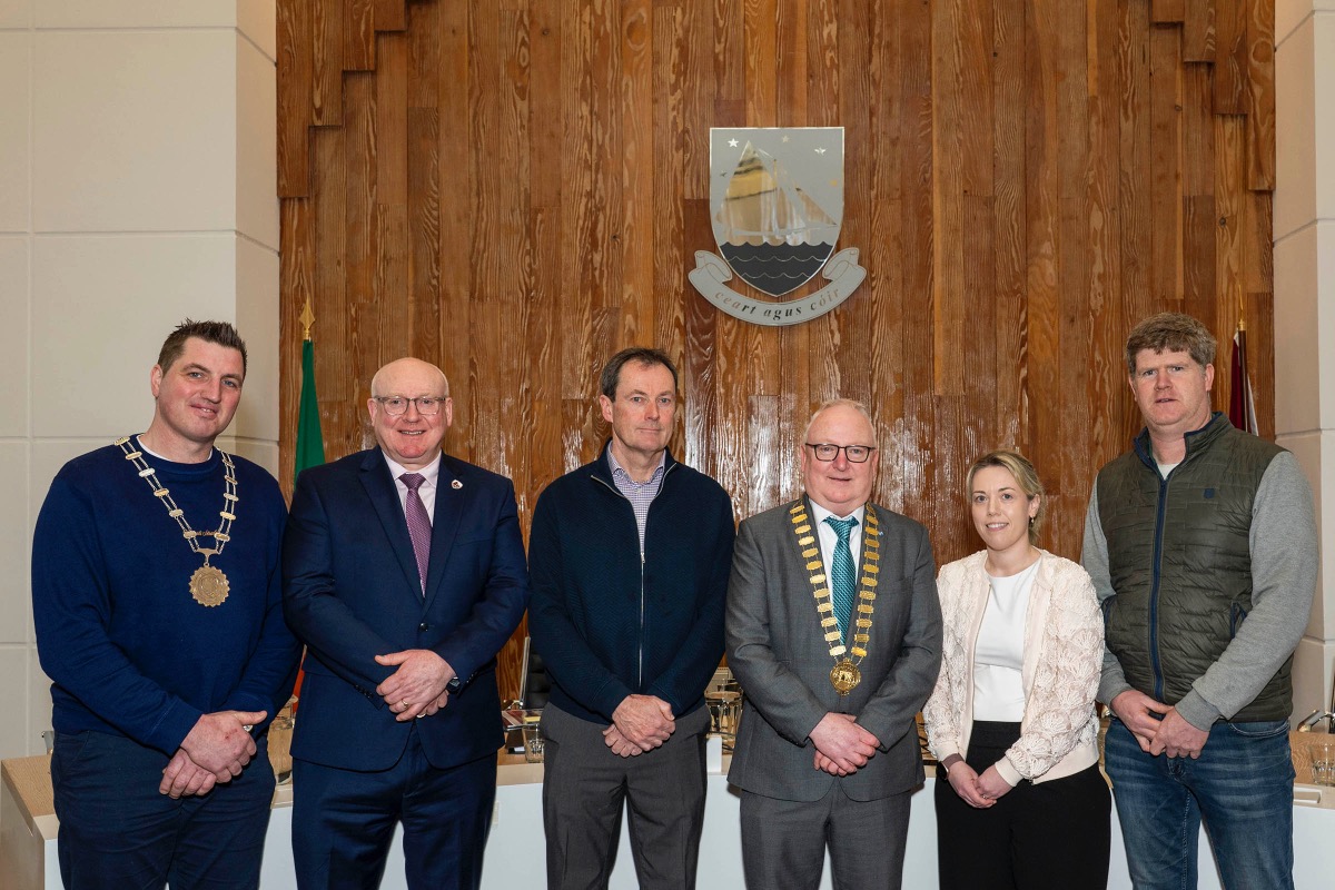 Pictured at Áras an Chontae for the signing of a contract for the delivery of the Civic Amenity Facility: Angela Galligan, Assistant Engineer, Environment; Mike Melody, Senior Executive Engineer, Environment; and Liam Conneally, Chief Executive (Galway County Council); Cathaoirleach of County Galway, Cllr. David Collins; and Brian Kenny, Director, Kenny Civils & Plant Ltd. Photo credit: Murtography.