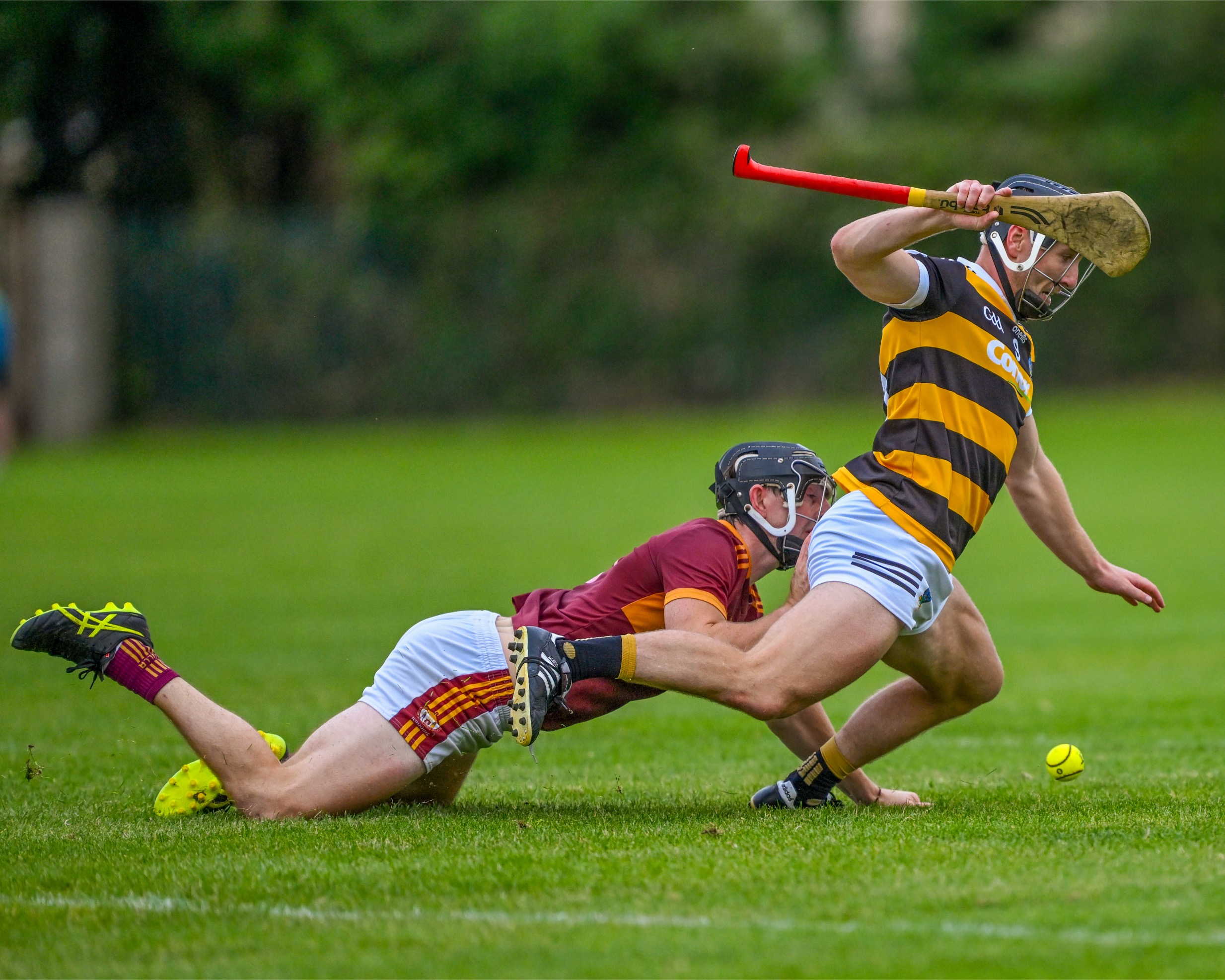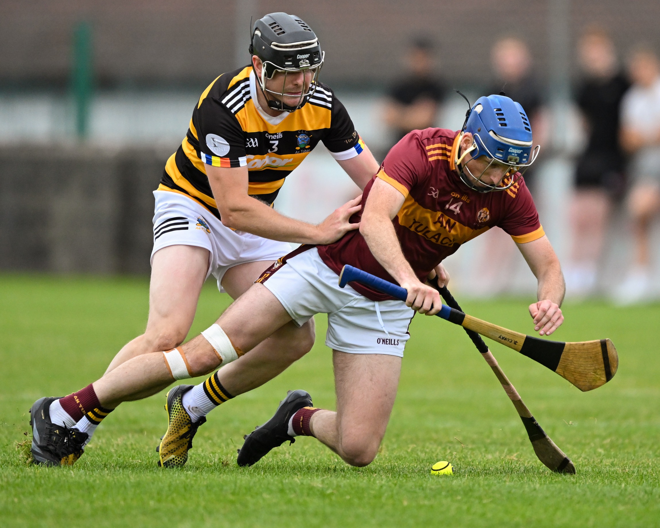 *Tubber’s Ronan Monahan struggles to keep his footing, his goal was decisive for their first round win. Photograph: Gerard O’Neill.