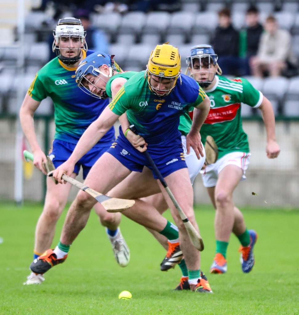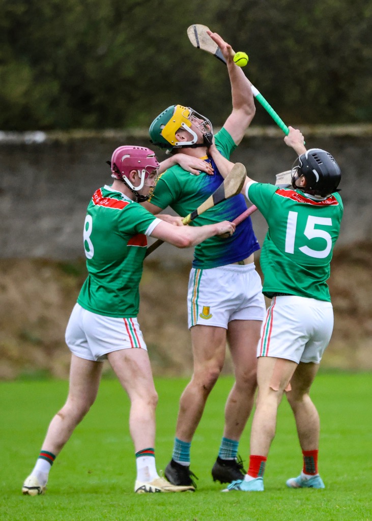 *Feakle/Killanena’s Keith Smyth holds off Matthew Corbett and Evan Maxted of Clooney/Quin. Photograph: Ruth Griffin