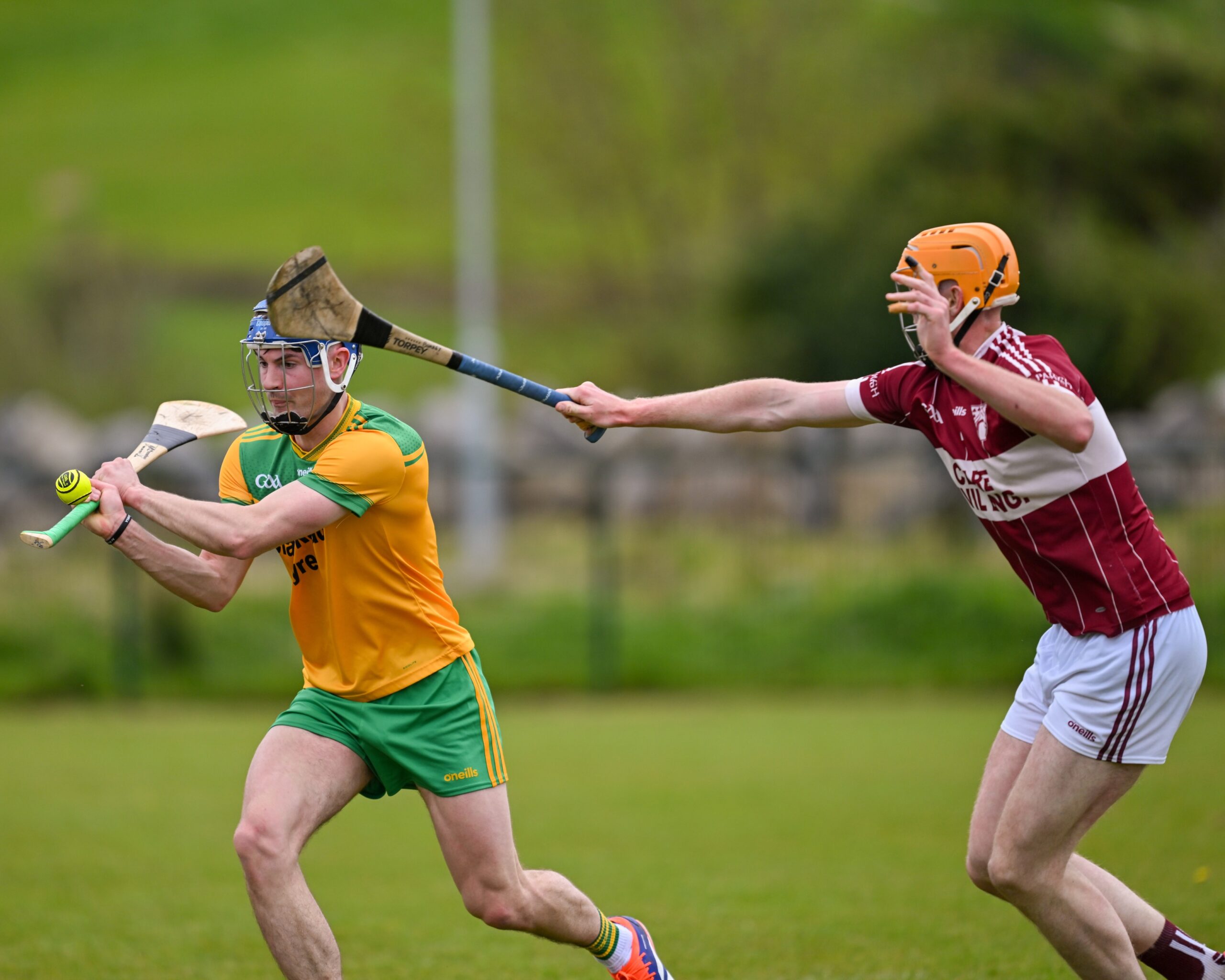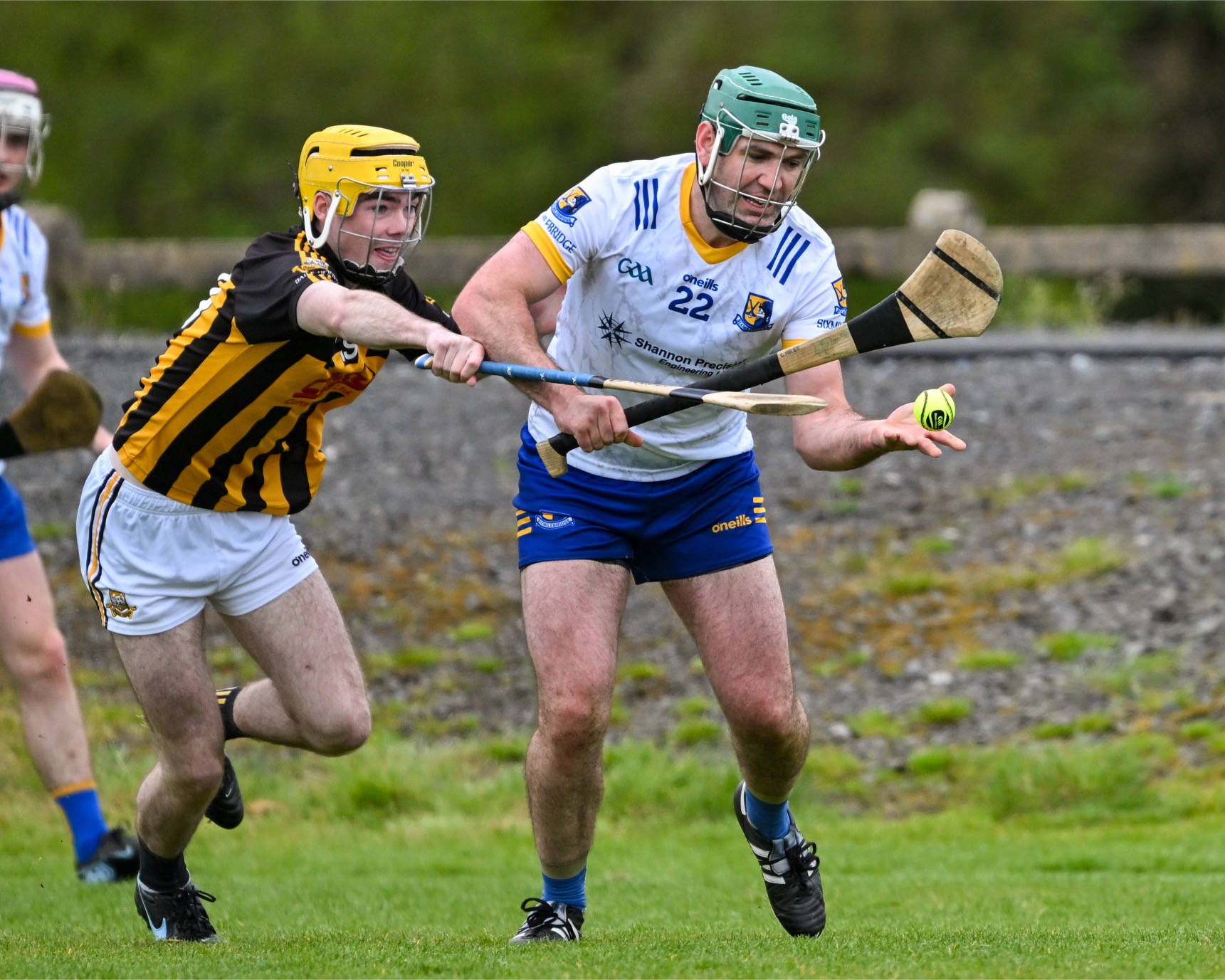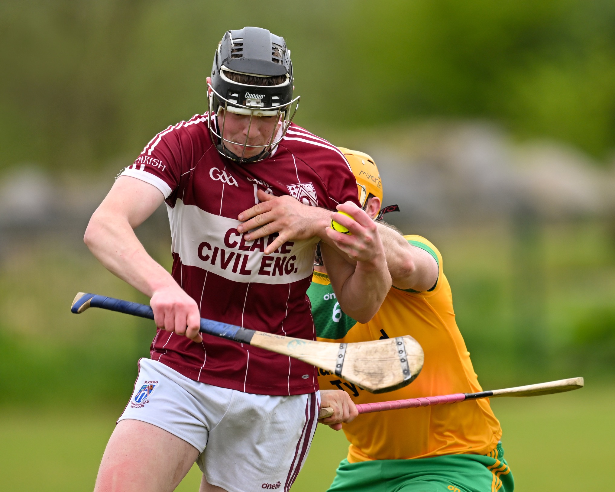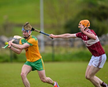 *Steven Conway of Feakle takes on Éire Óg’s Aaron Fitzgerald. Photograph: Gerard O’Neill.
