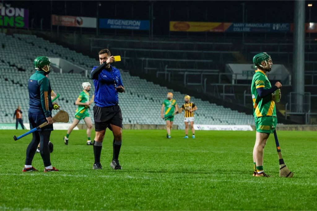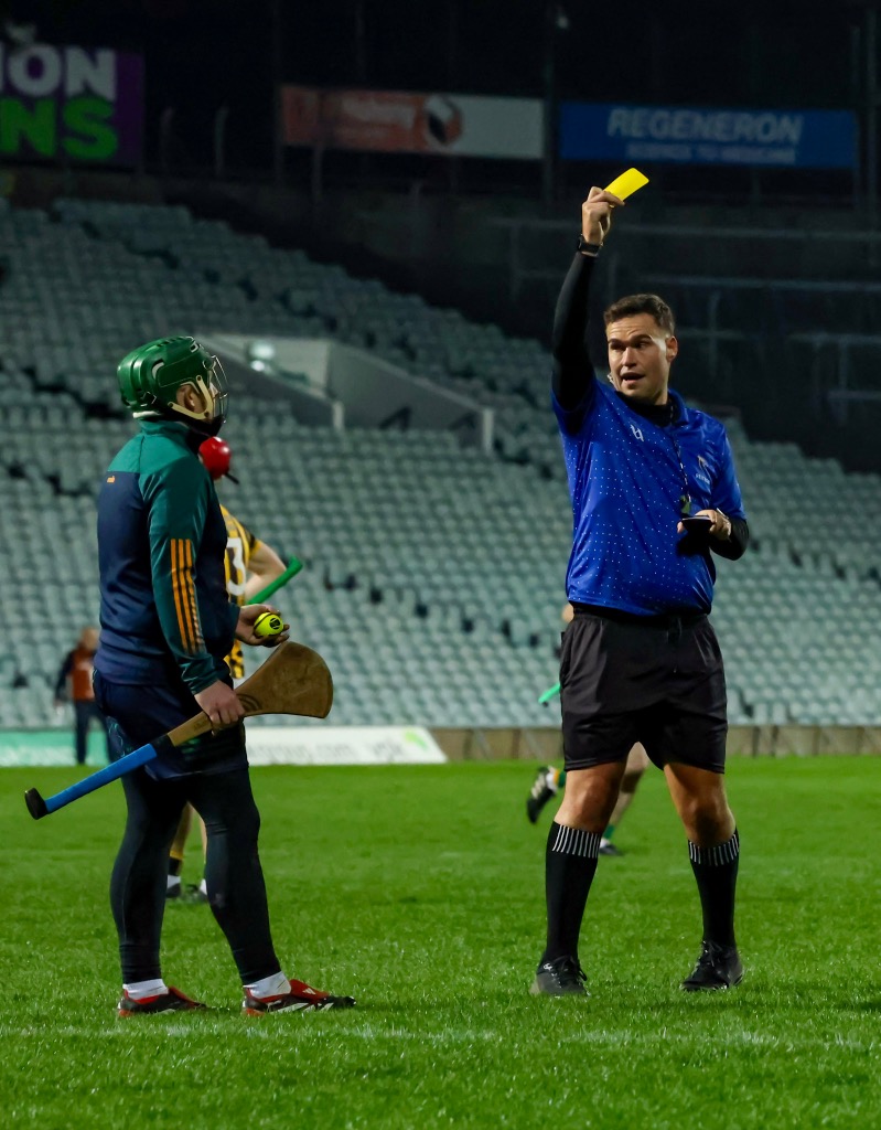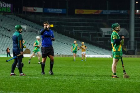 Within the space of thirty seconds, he brandished a total of five yellow cards all to two players as Jacob Loughnane picked up a second yellow card followed by a red before Conor Henry received two yellows in the space of seconds for sharing his views on the officiating.
