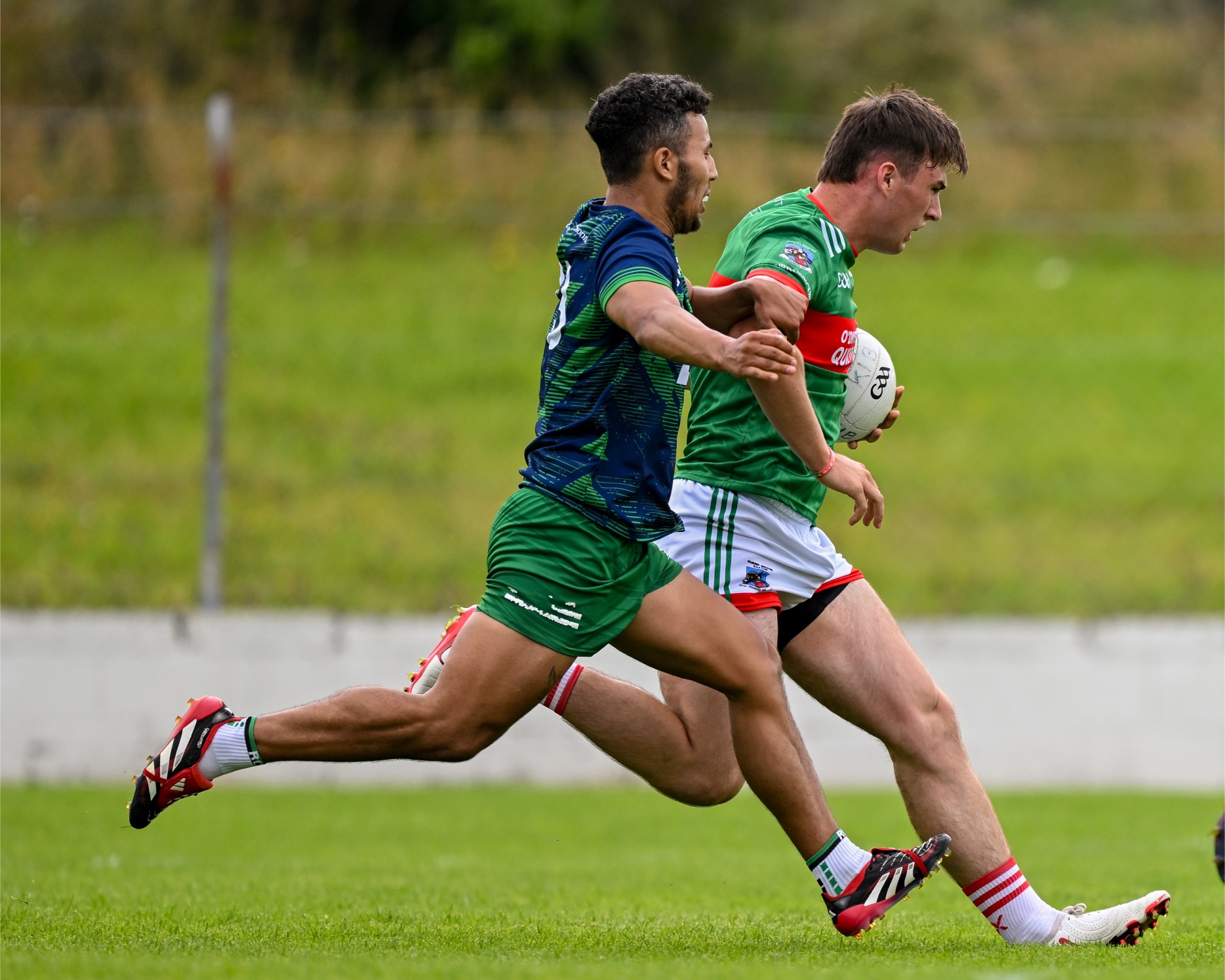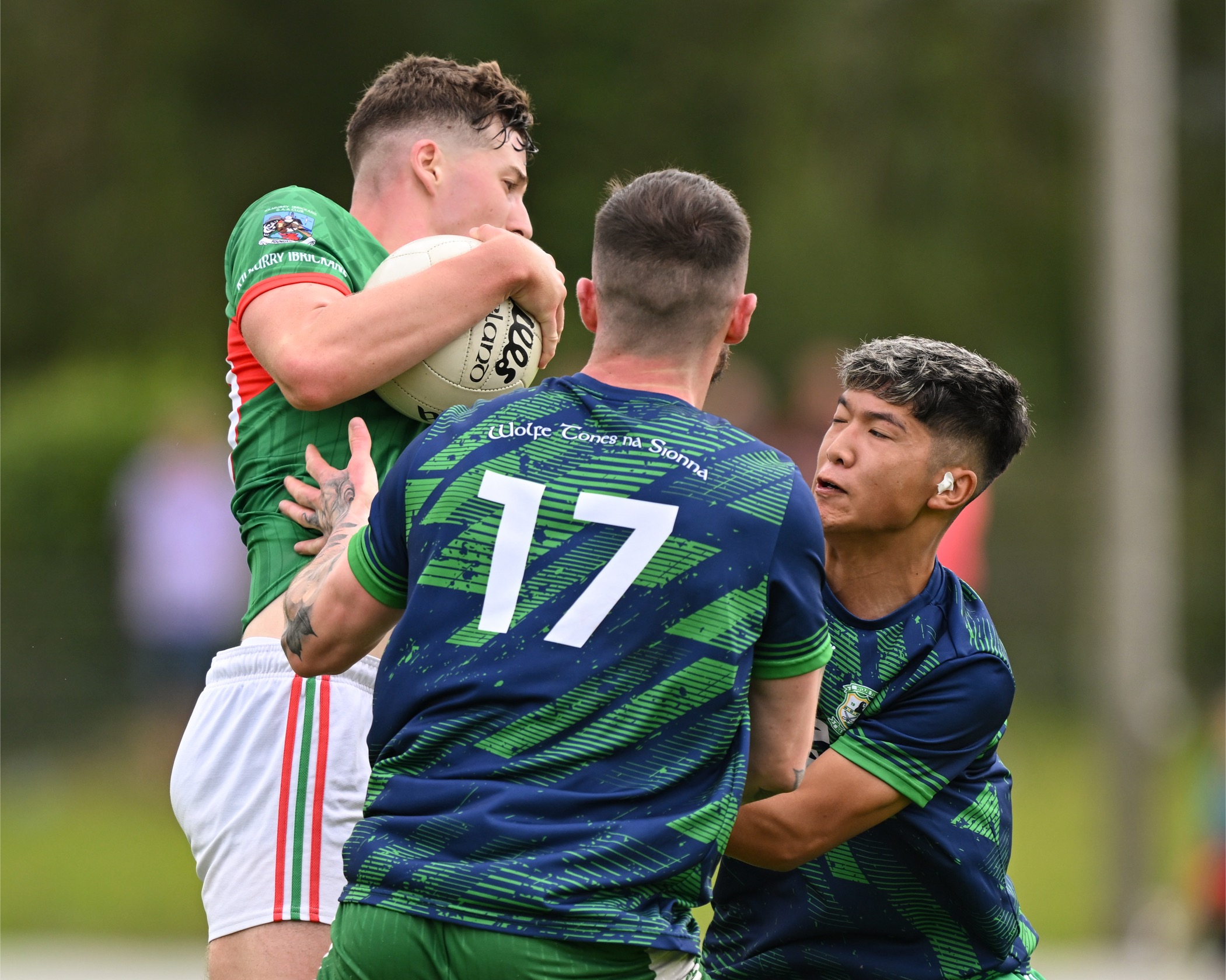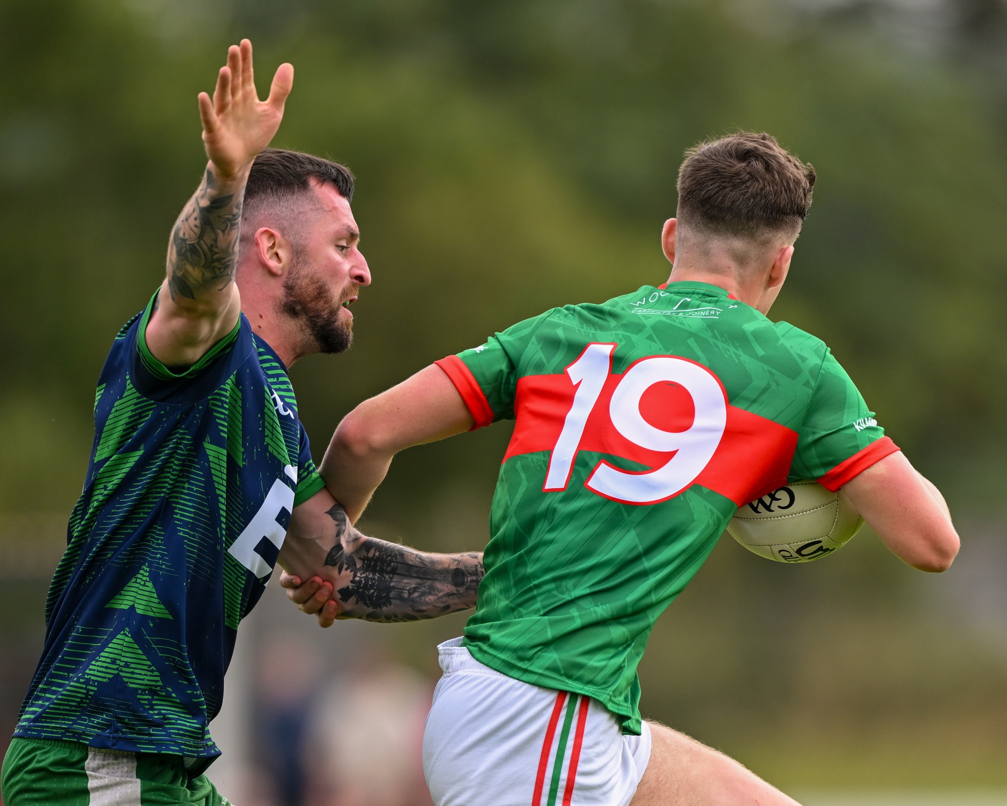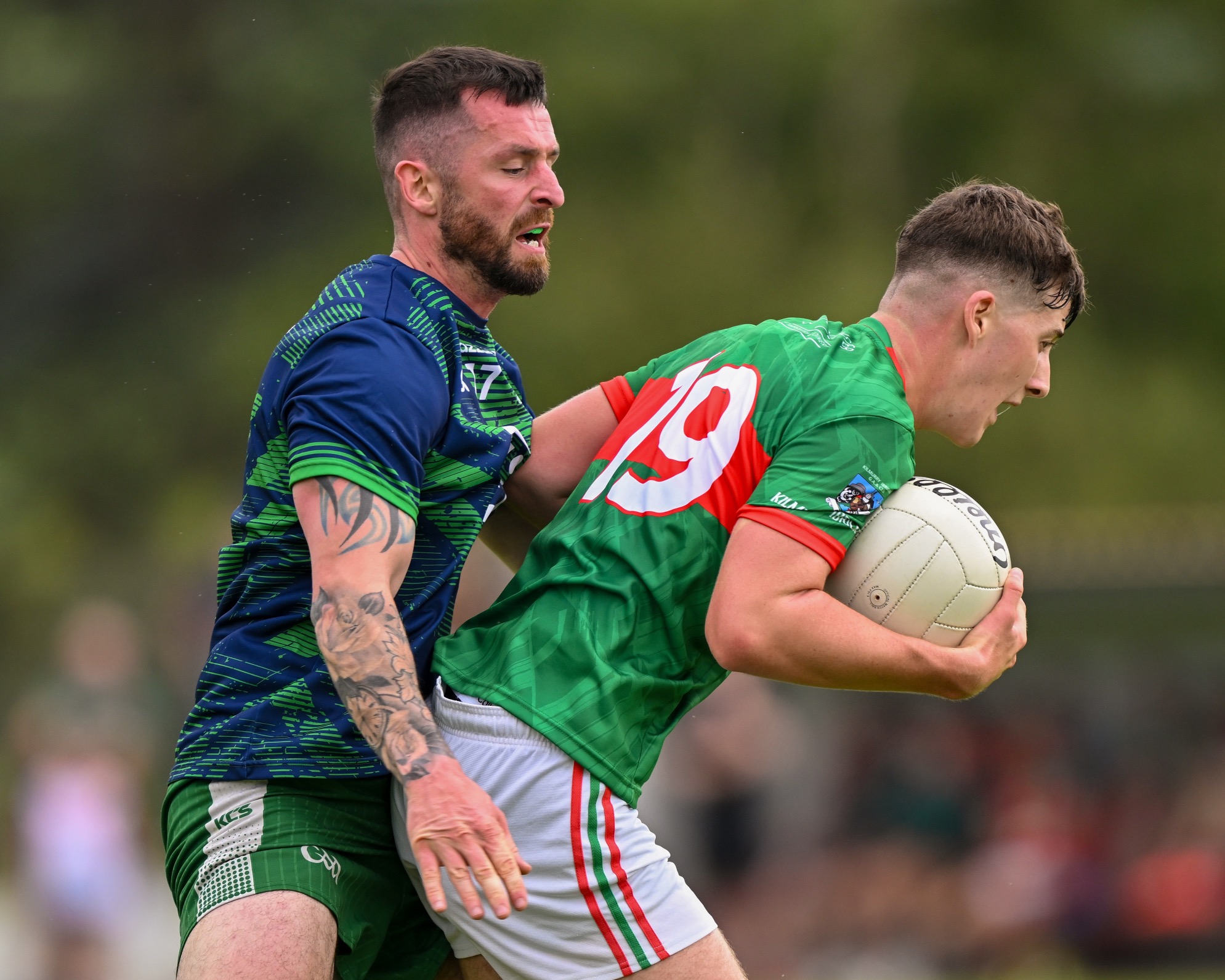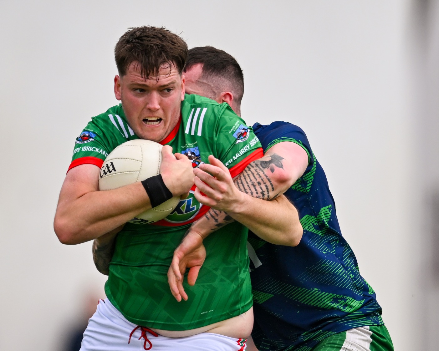 *Kilmurry Ibrickane’s Daryn Callinan is tackled by Aaron Brennan of Wolfe Tones. Photograph: Gerard O’Neill