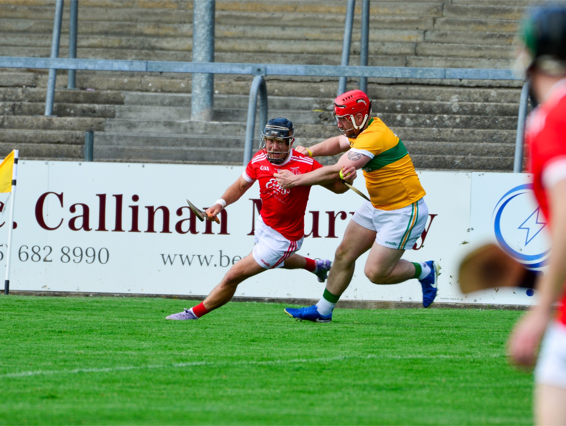 The game produced a couple of flash points and referee Eoghan O’Leary issued yellow cards to a member of each backroom team in separate incidents. The card to the Éire Óg mentor was somewhat surprising as it was to a member of their medical team who, it appeared, went onto the playing area to tend to a player who had taken a knock.