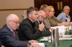 *Clare Camogie chairperson Fergal O’Brien addressing Convention. Photograph: Joe Buckley SERVING...