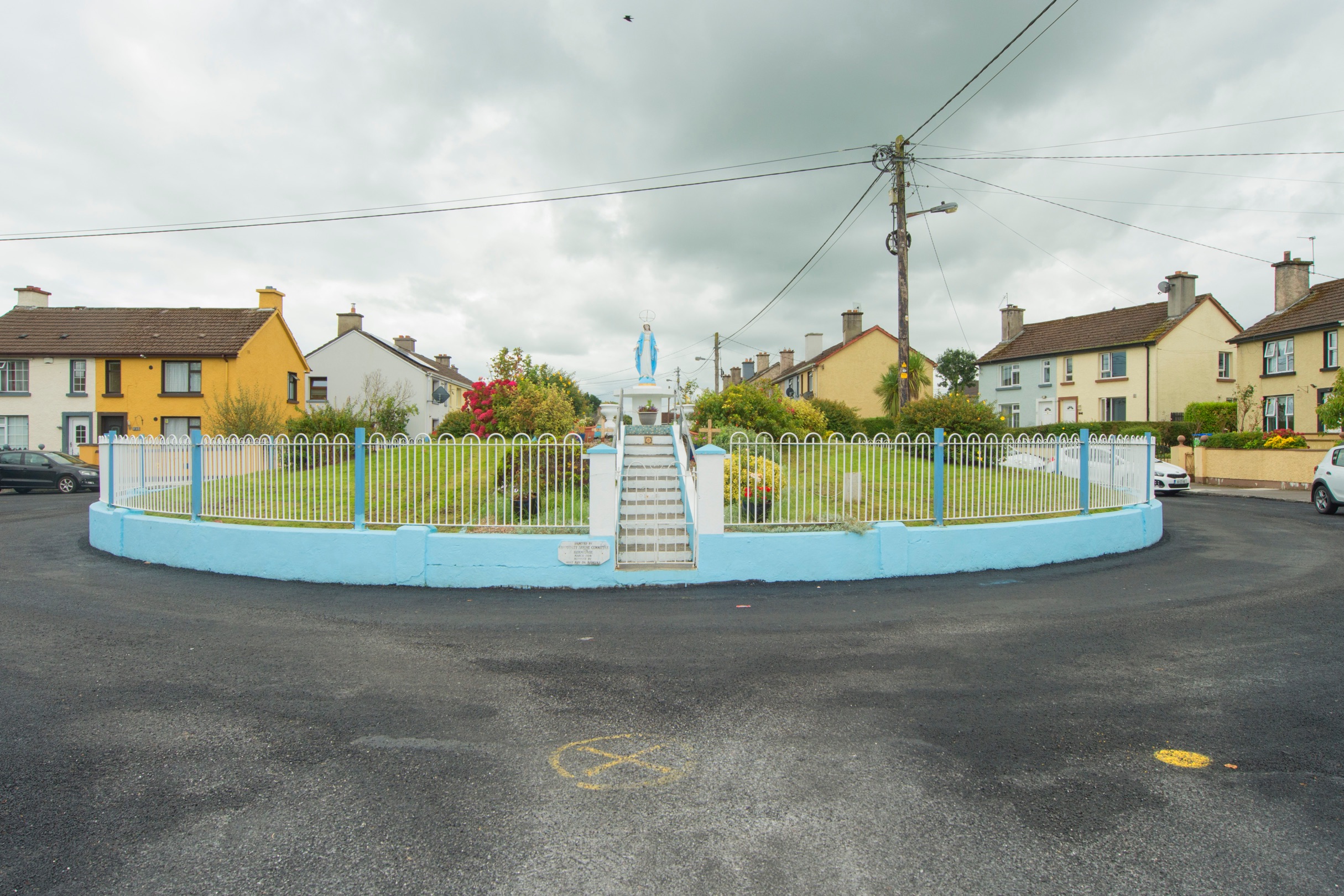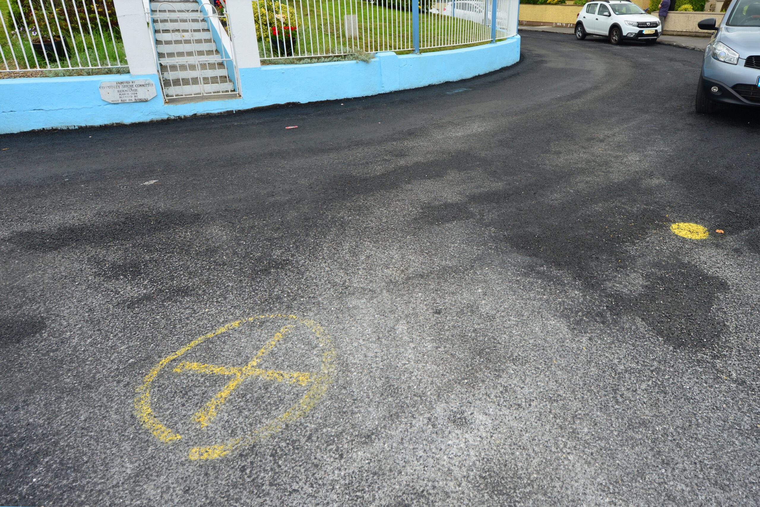 Brid Dinan has been living in Hermitage for the last fifty eight years, she is a central figure involved in maintaining The Grotto, the focal point of The Tage but the recently painted exterior has been covered in splatters from the tarmacadam. “It is a disgrace, I live over there, we had a lovely concrete road and they came along and tarred it over, it is up and down now with water lodging on it, they have the Grotto wall destroyed,” she said.