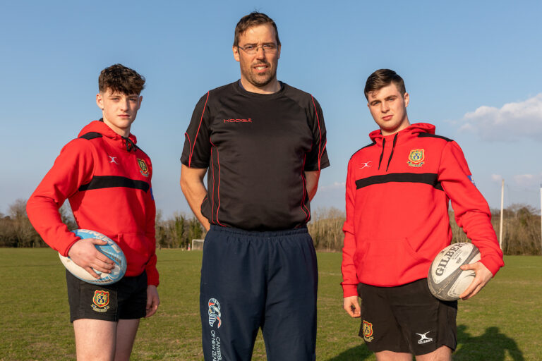 Ennis Rugby Club Coach, John Queally with players Michael Sweeney and Odhran Flynn. Photograph: Natasha Barton.