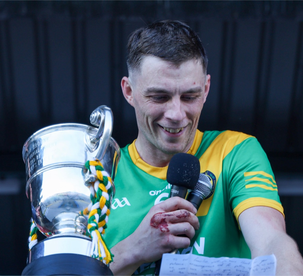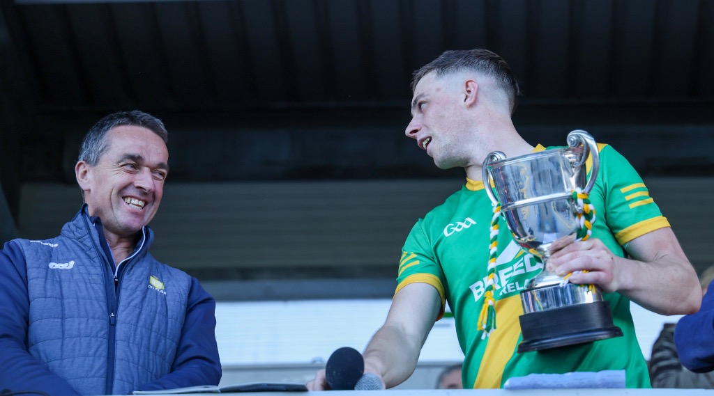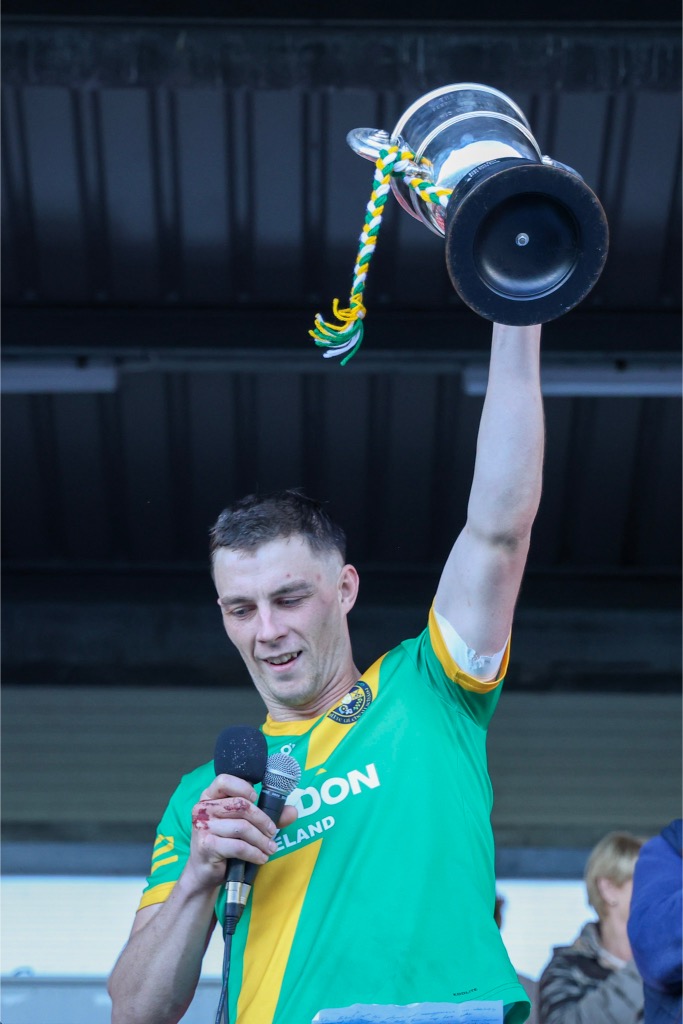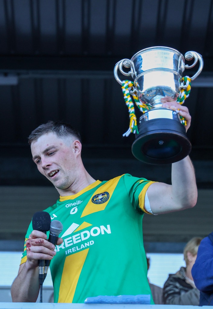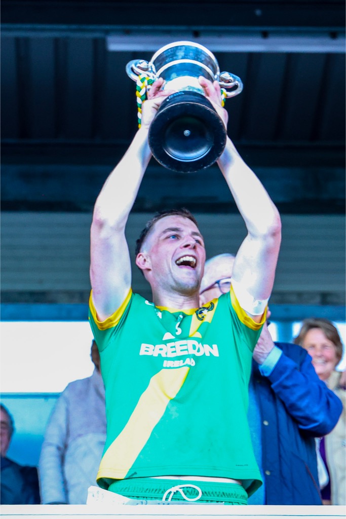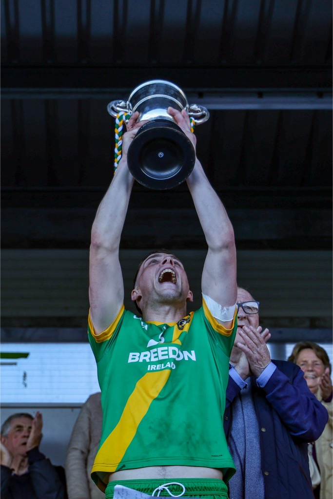 *Aidan O’Gorman lifts the Paddy Browne Cup. Photograph: Gerard O’Neill.