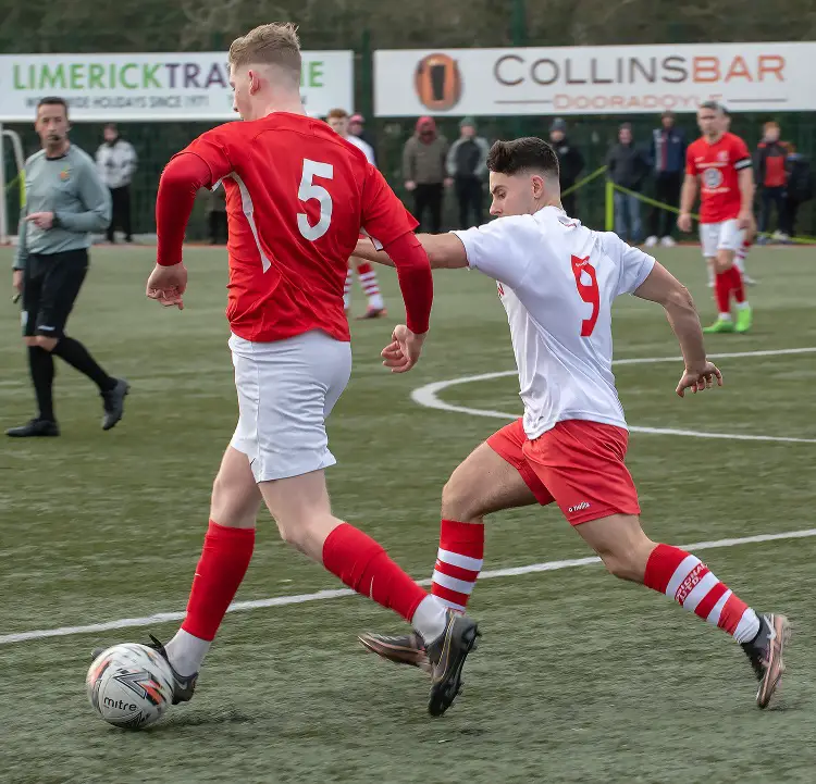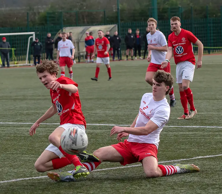 Sixmilebridge’s Filip Mostowy had a glorious chance to put Regional Utd ahead with seven minutes played and were it not for a superbly timed tackle by Harvey Cullinan moments later Paudie Hartigan was on course to rattle the net.