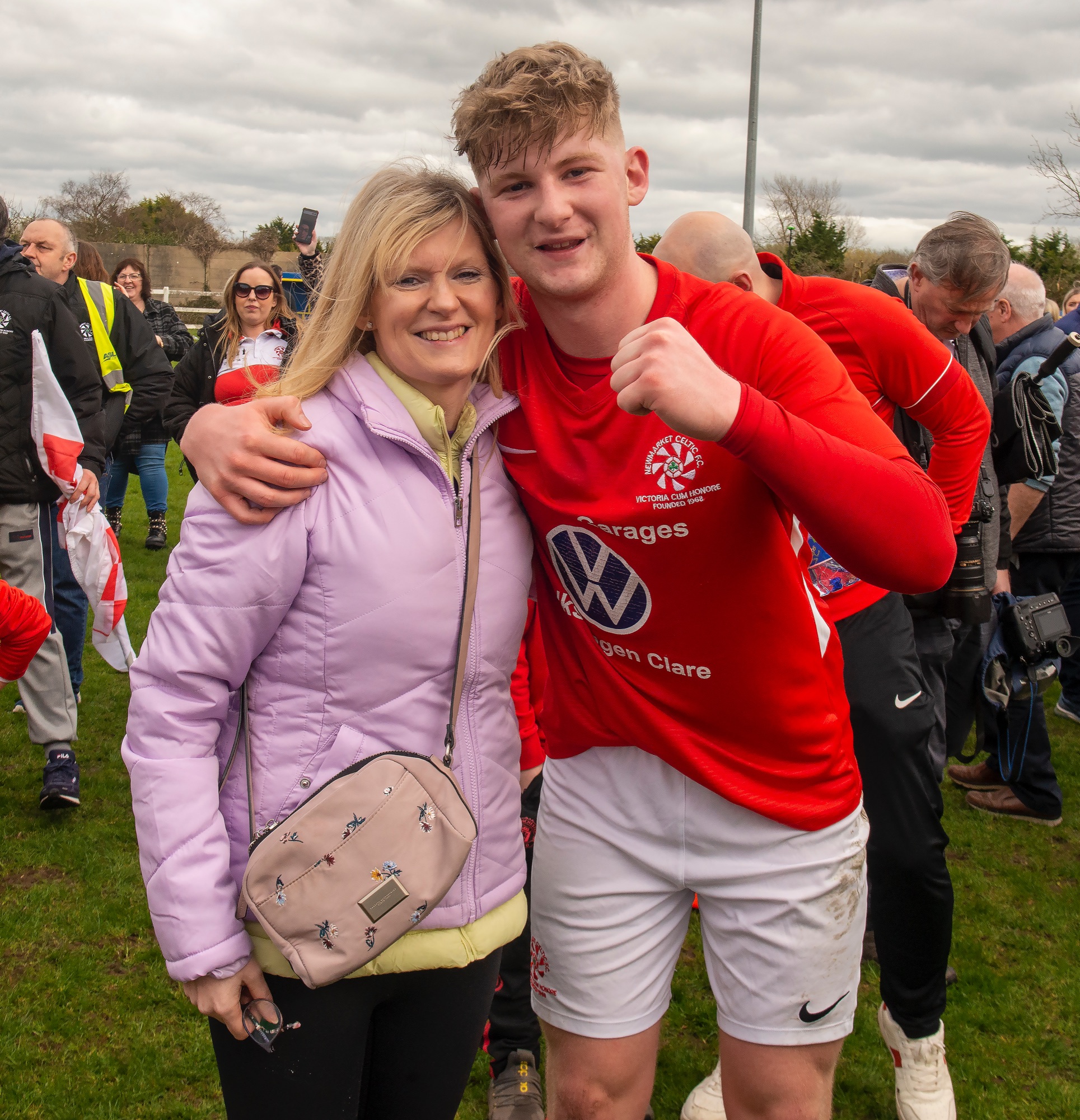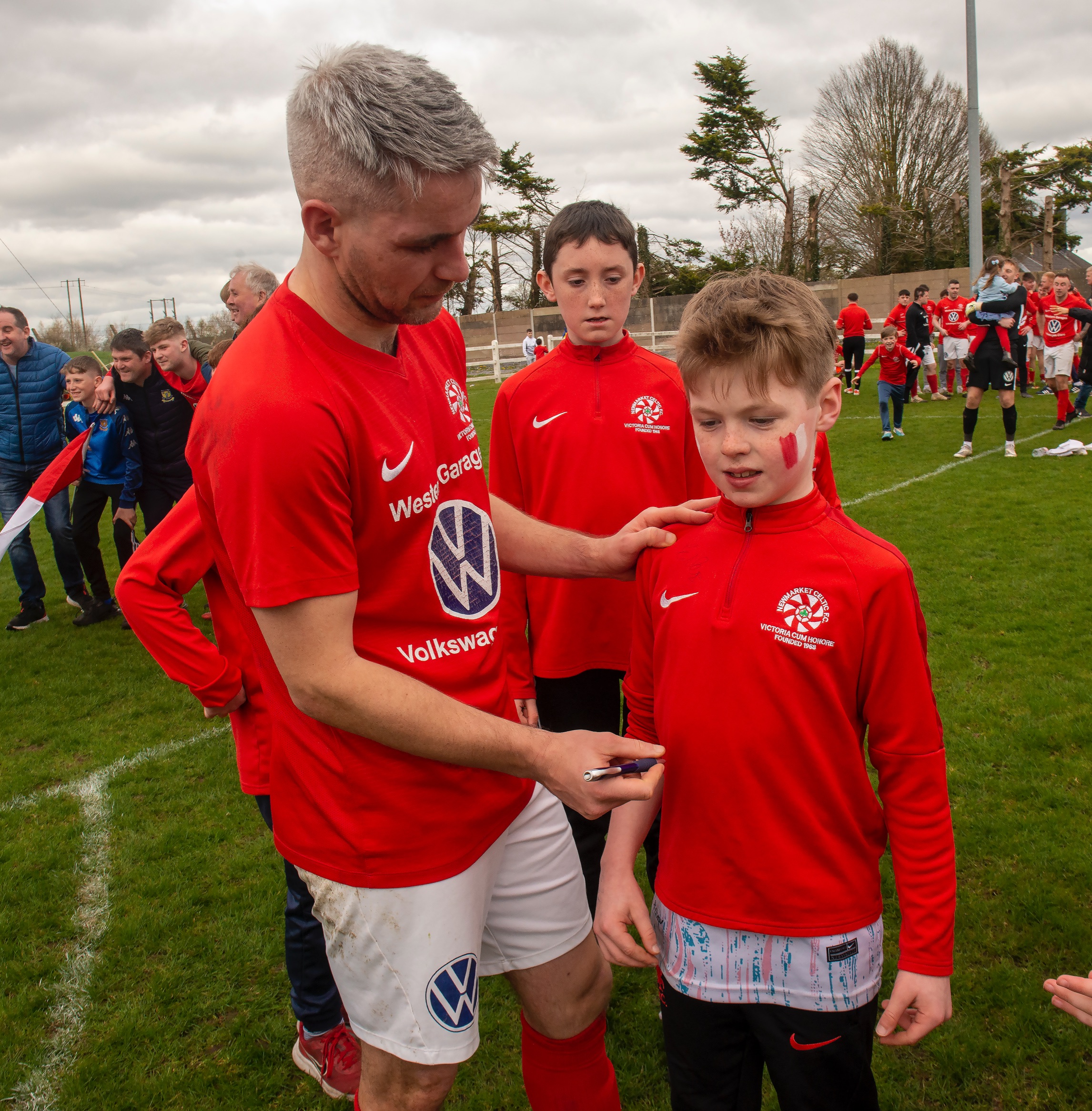 This perseverance paid off, aided by a quick restart as Gearoid O’Brien took a throw from the right wing, found captain Eoin Hayes, the initial shot from the stiker was saved but he did very well to regain the ball immediately where he controlled it and then fired the rebound to the roof of the net to send the crowd wild with eighty minutes on the clock. It was fitting that Hayes would be the hero, given the contribution of his entire family to the club over many years and his standing as a hero was evident as he signed autographs on the pitch in the aftermath.