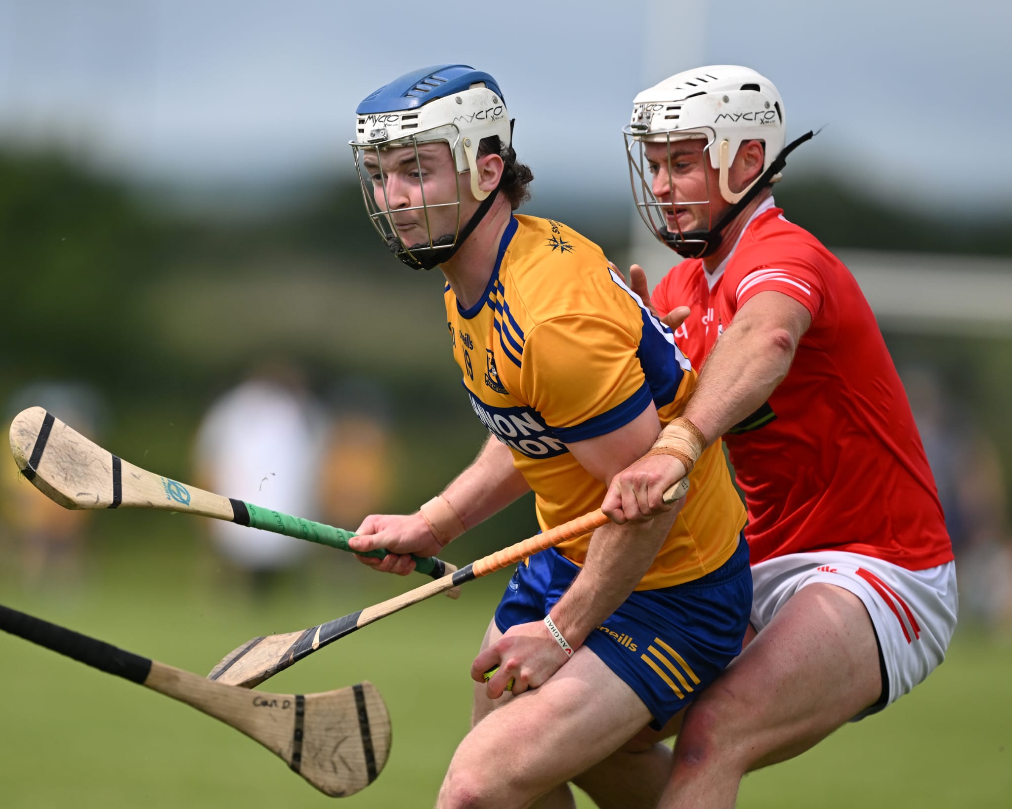 *Sixmilebridge’s Lorcan Fitzpatrick competes with Jamie Fitzgibbon of Crusheen. Photograph: Gerard O’Neill.