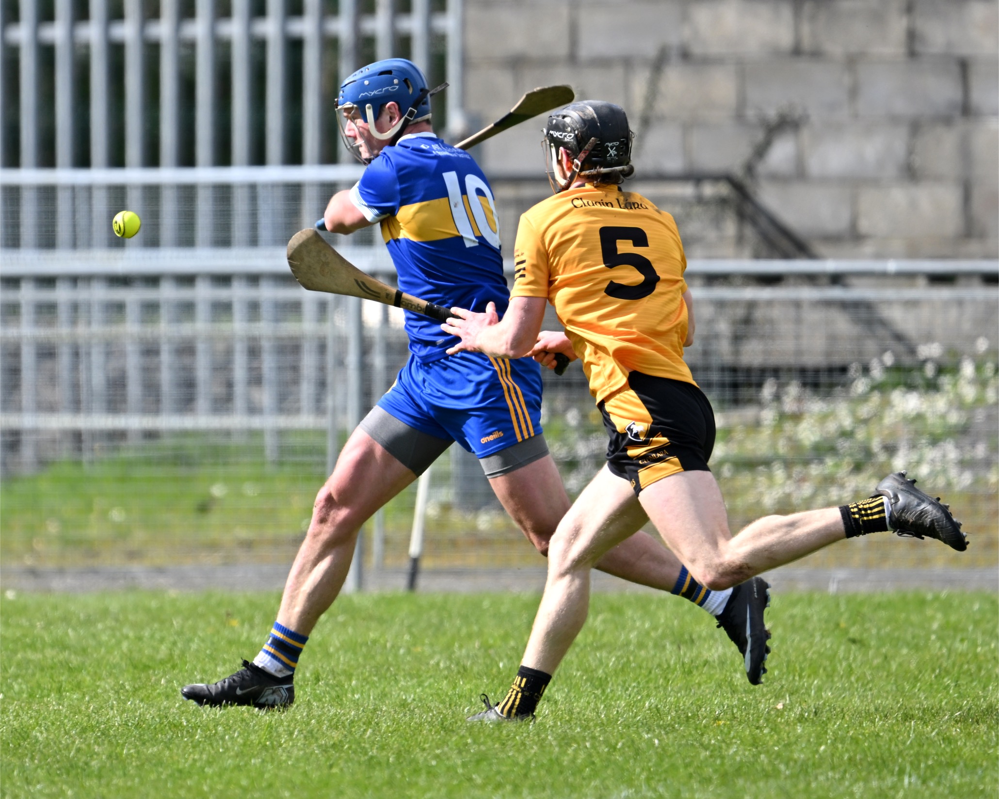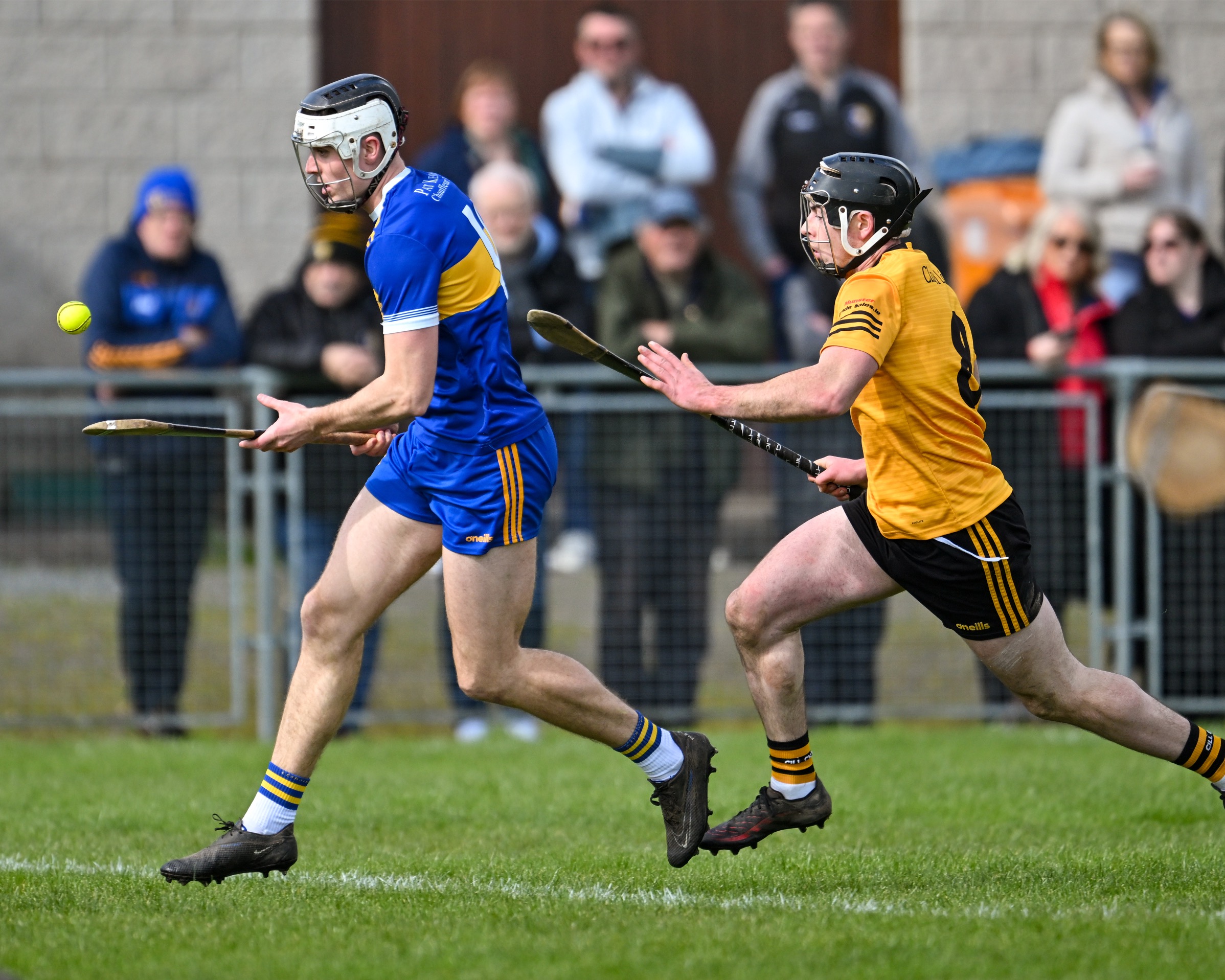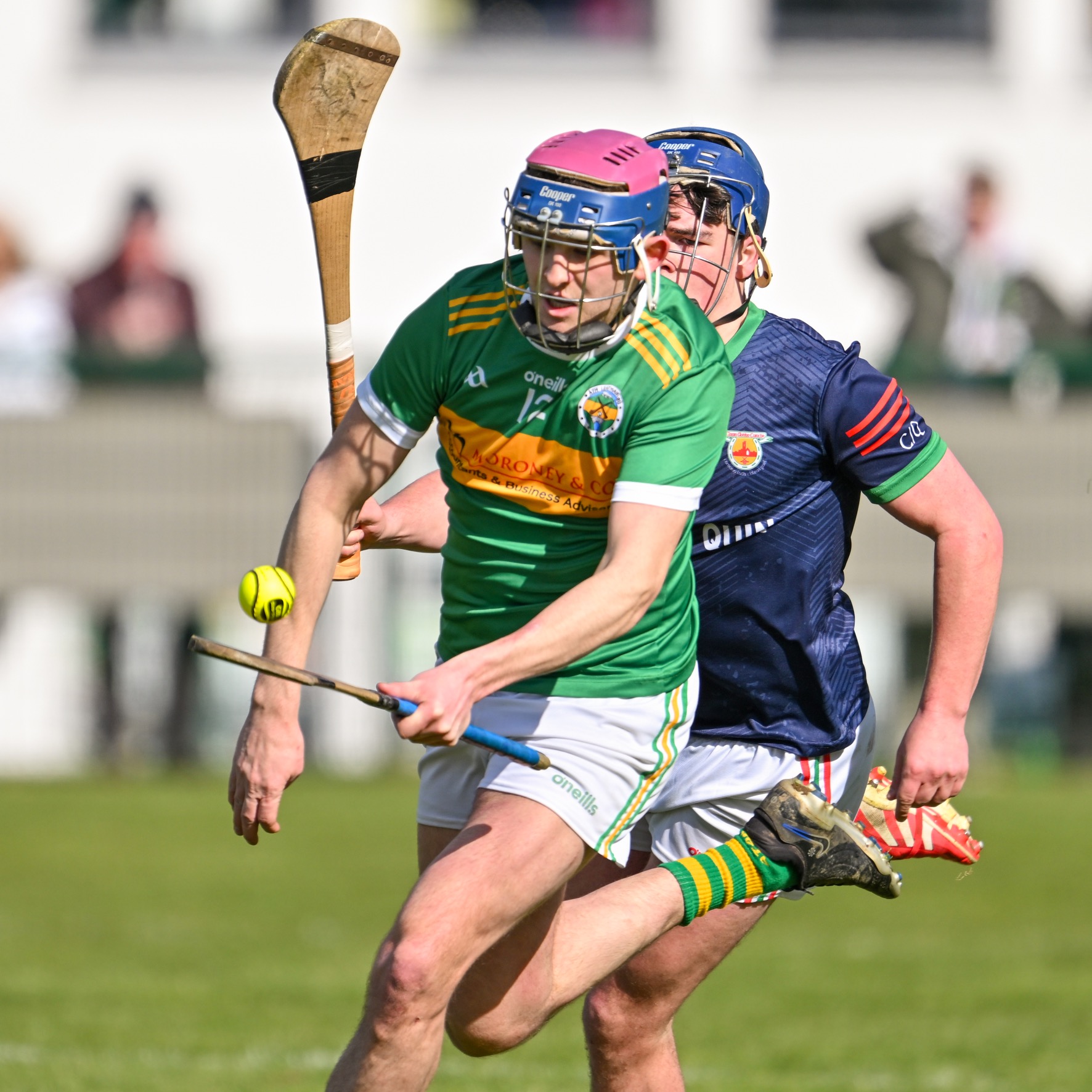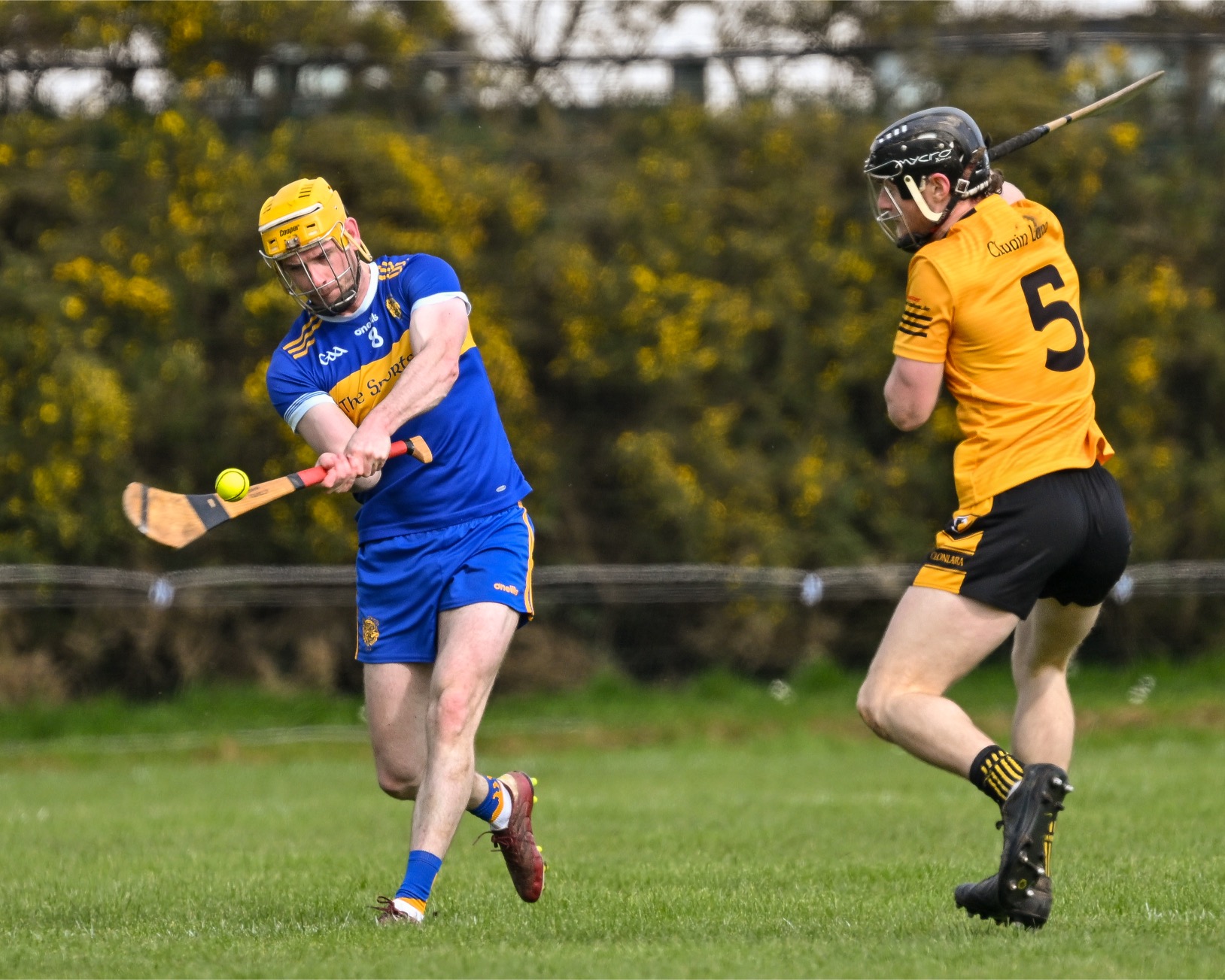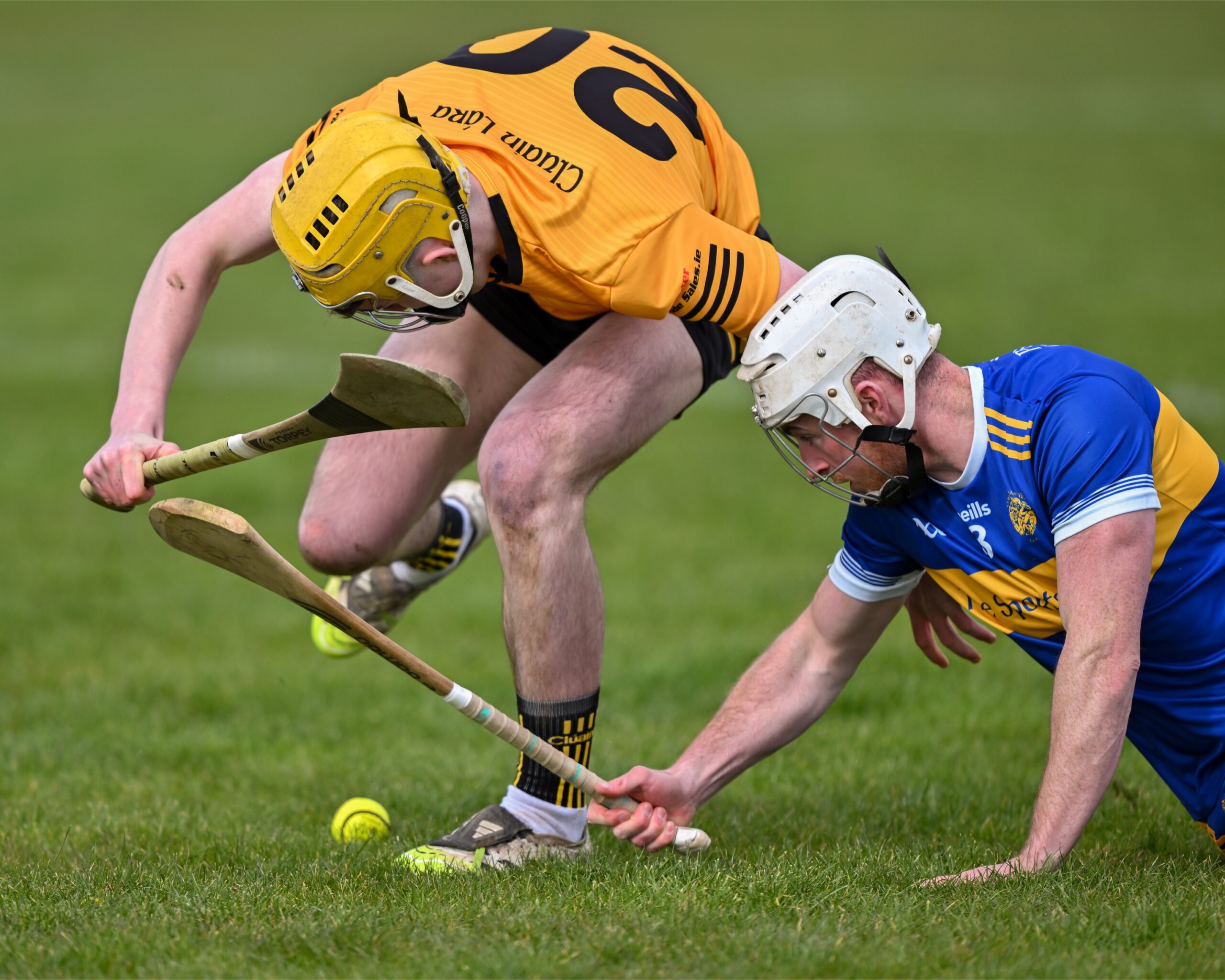 *Clarecastle’s Rory O’Connell under pressure from Oran Cahill of Éire Óg. Photograph: Gerard O’Neill.