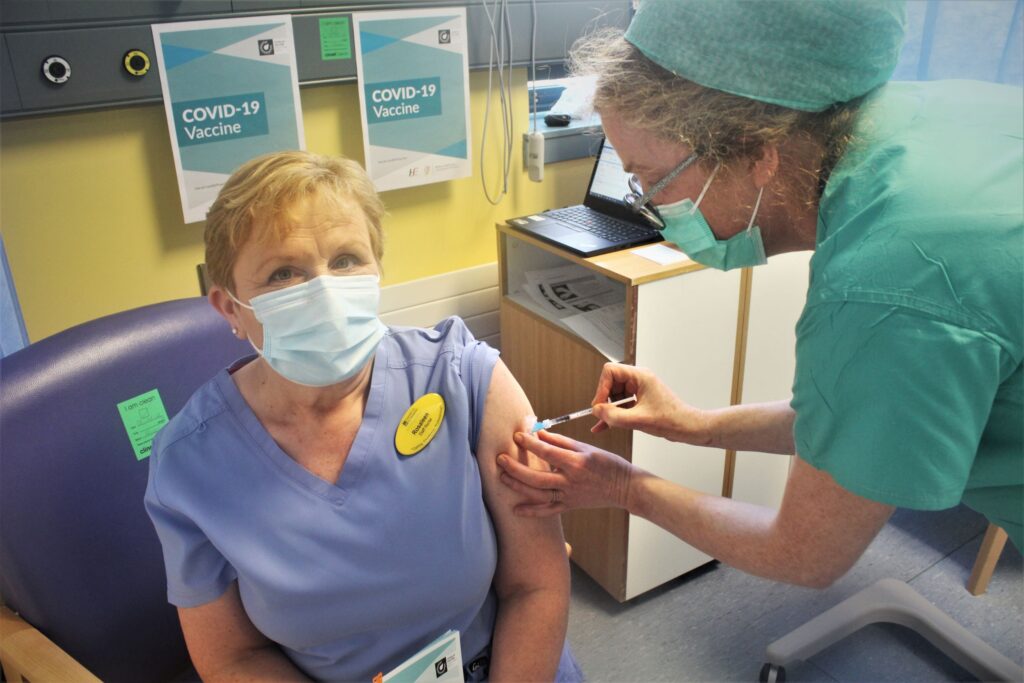 Staff Nurse Rosaline O’Brien this Monday morning became the first healthcare professional in the Mid-West to receive a vaccine against COVID-19.